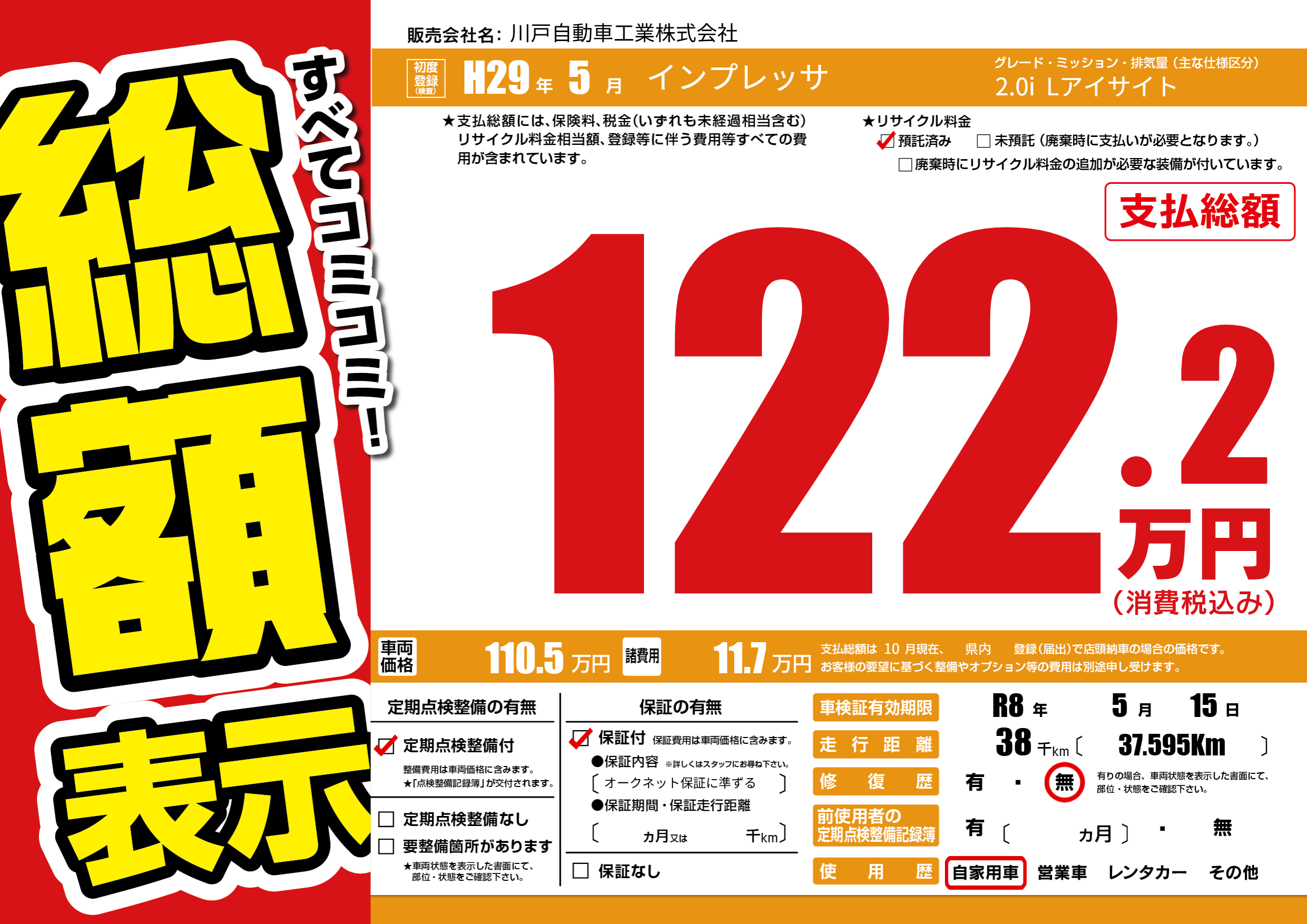 | 車名 | インプレッサ | グレード ミッション 排気量 |