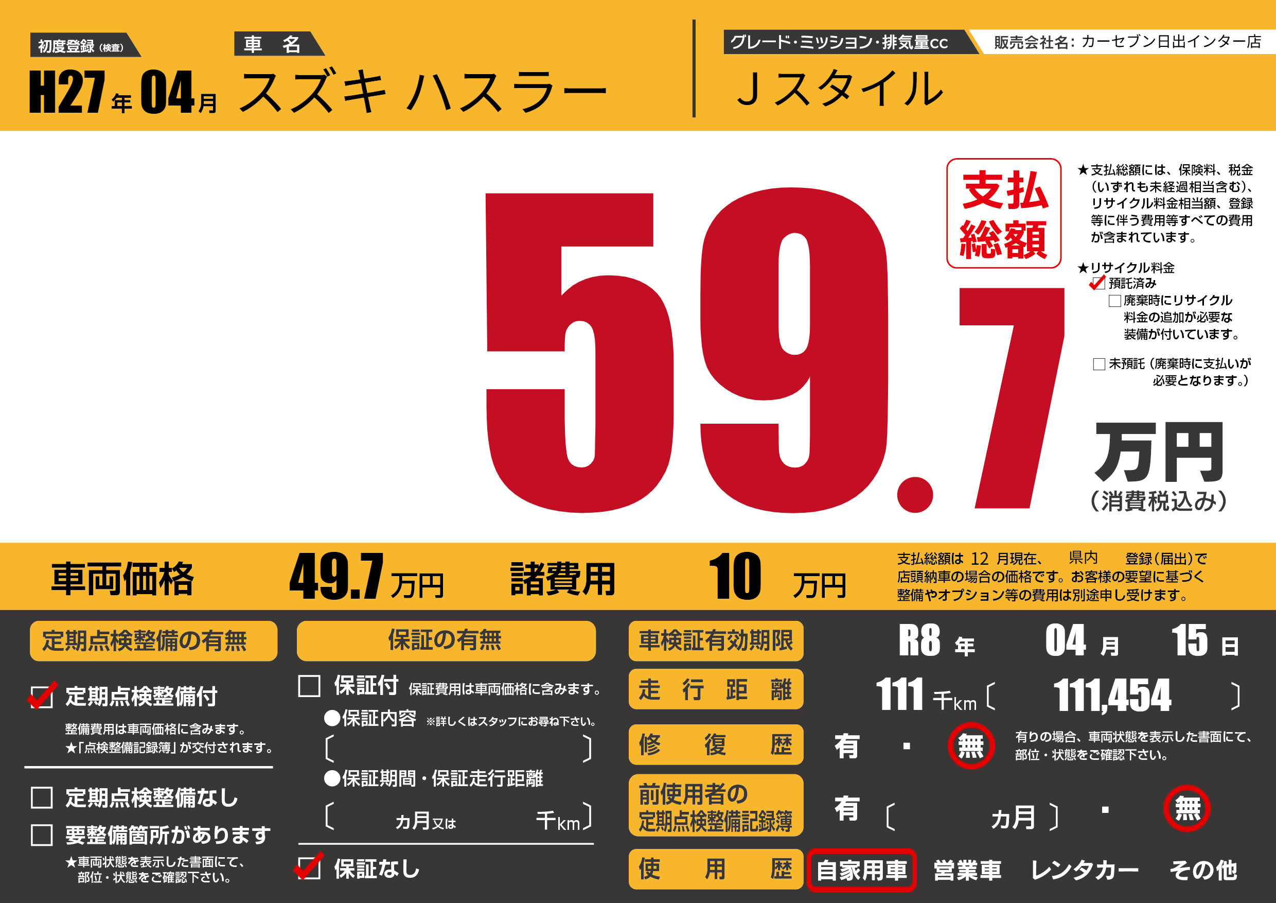 | 走行キロ | 11.1万km | 初年度登録 | H27年04月 |