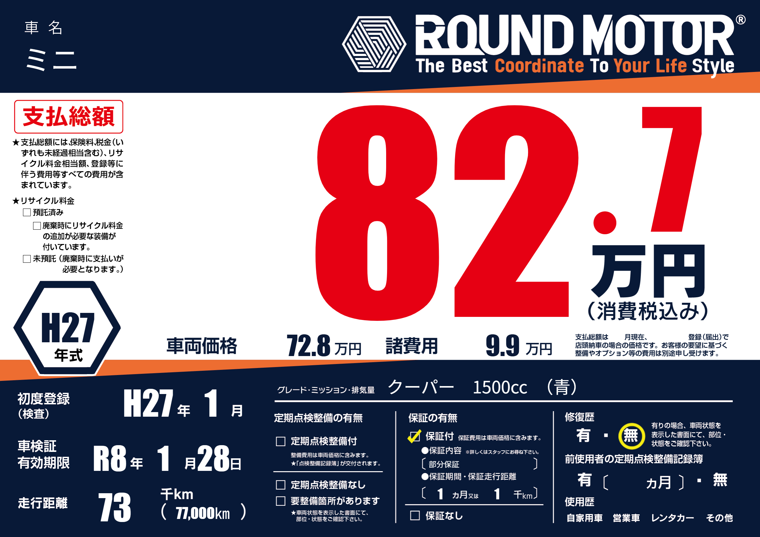 | 走行キロ | 7.3万km | 初年度登録 | H27年1月 |