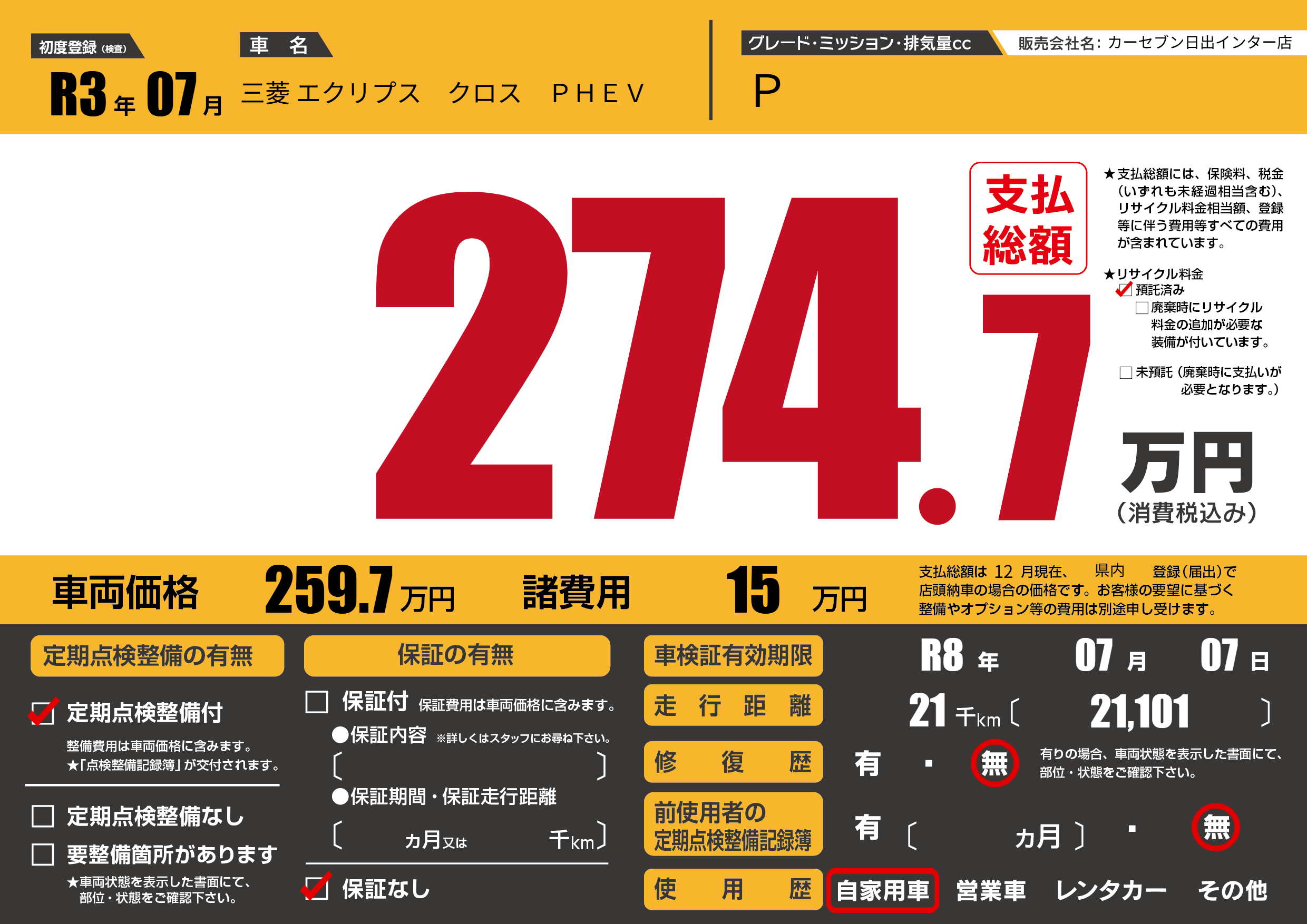 | 車名 | 三菱 エクリプス クロス PHEV | グレード ミッション 排気量 |