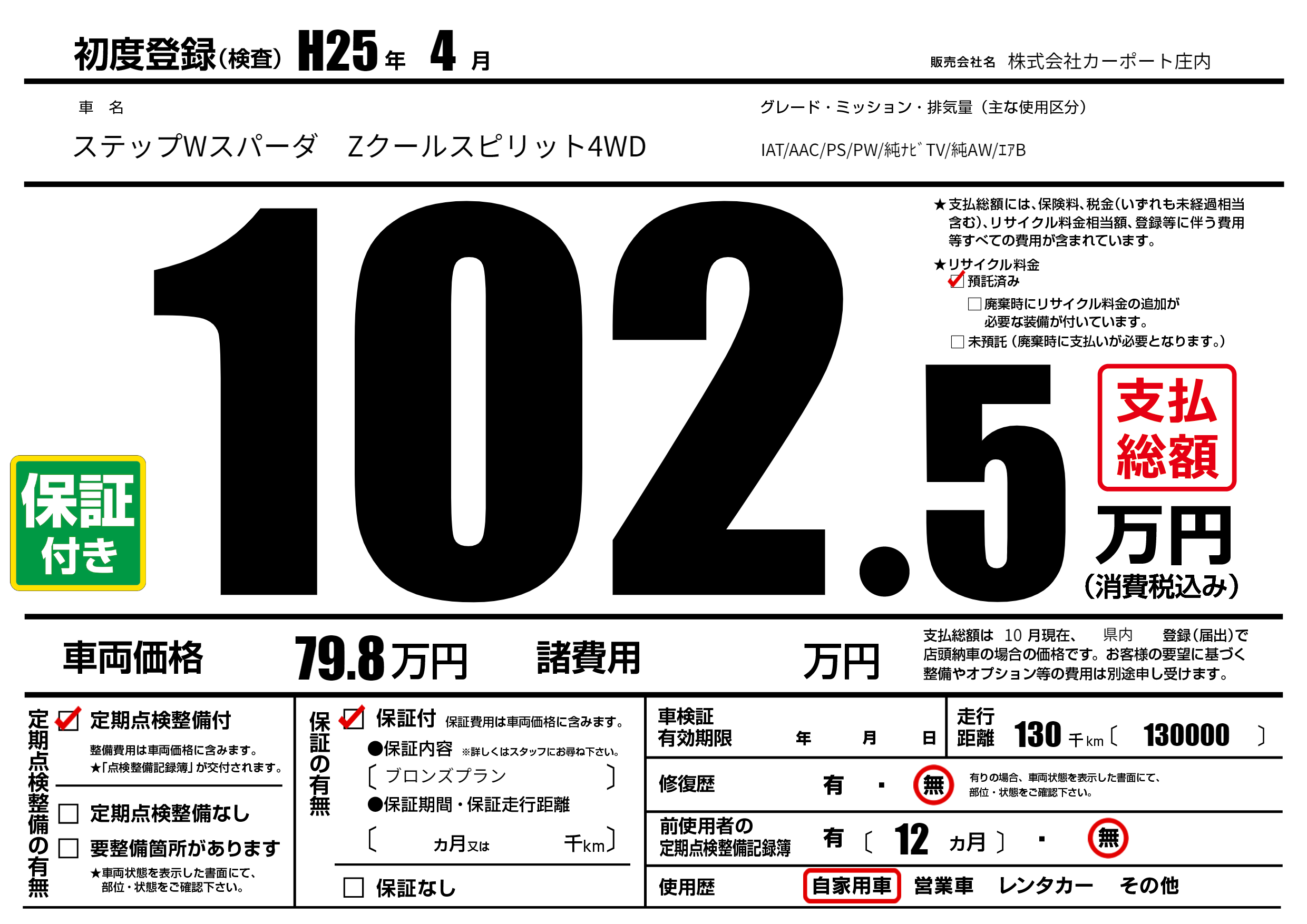 | 車名 | ステップWスパーダ Zクールスピリット4WD | グレード ミッション 排気量 |