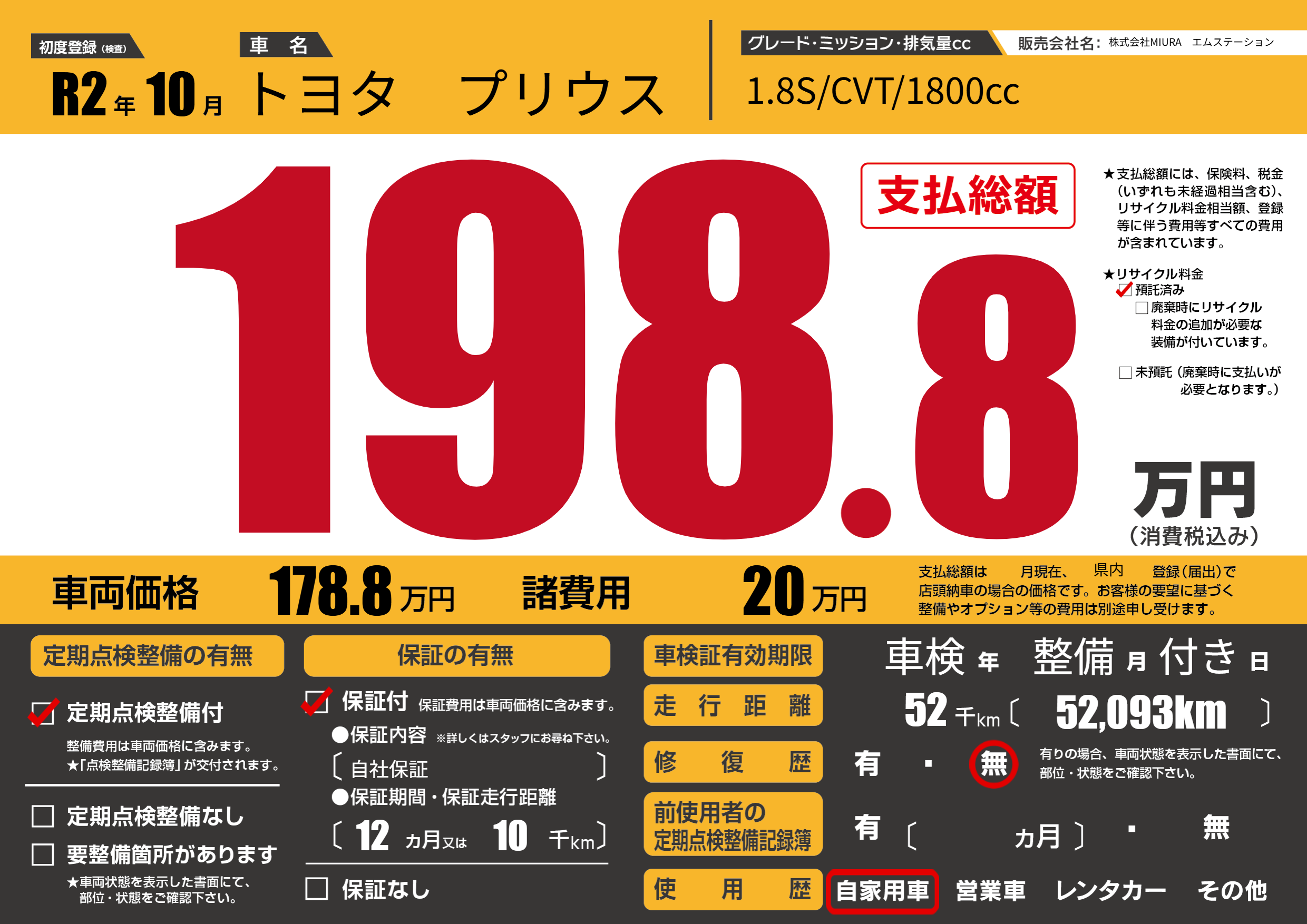 | 車名 | トヨタ プリウス | グレード ミッション 排気量 |