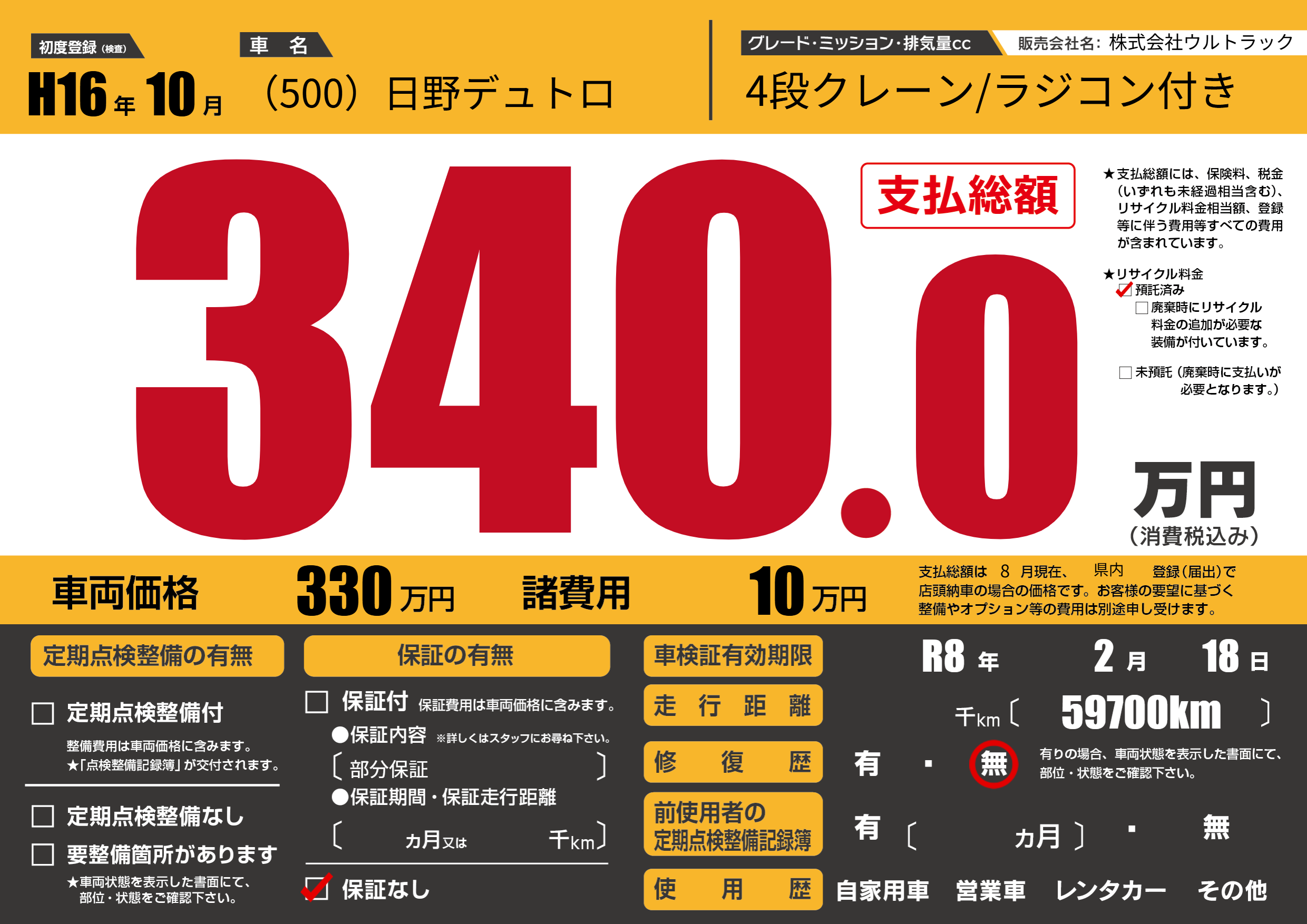 | 車名 | (500)日野デュトロ | グレード ミッション 排気量 |