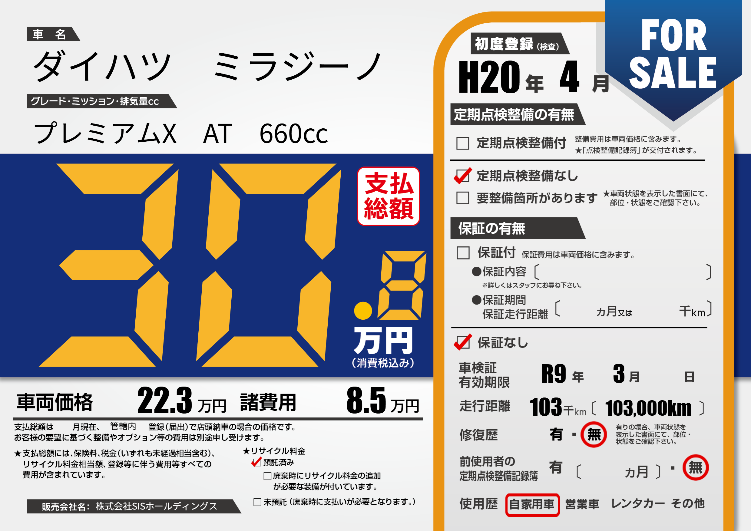 | 走行キロ | 10.3万km | 初年度登録 | H20年4月 |