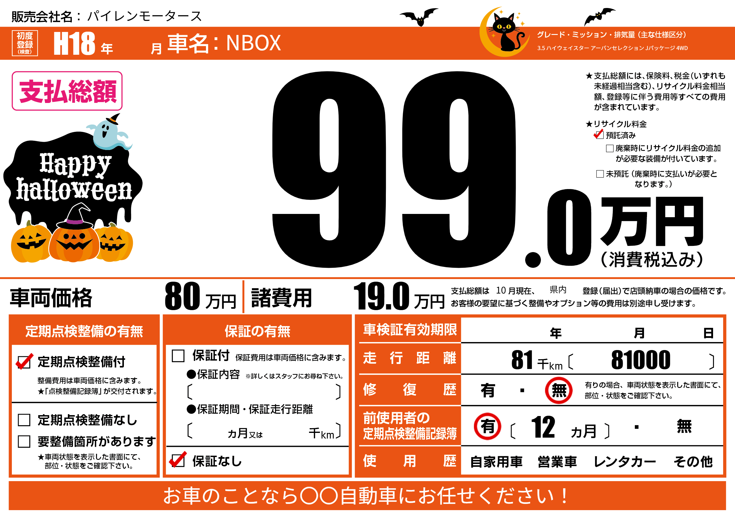 | 車名 | NBOX | グレード ミッション 排気量 |