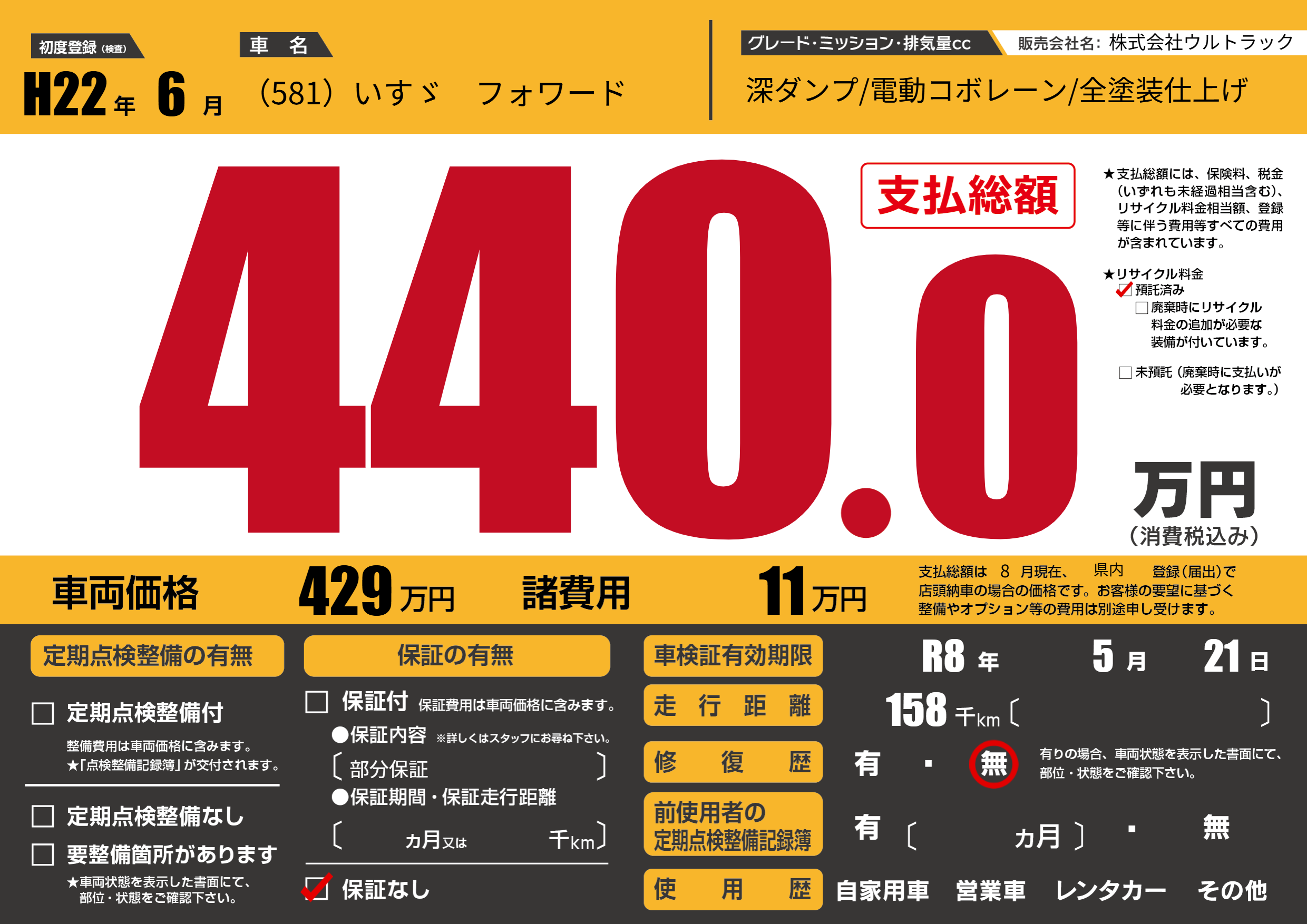 | 走行キロ | 15.8万km | 初年度登録 | H22年6月 |