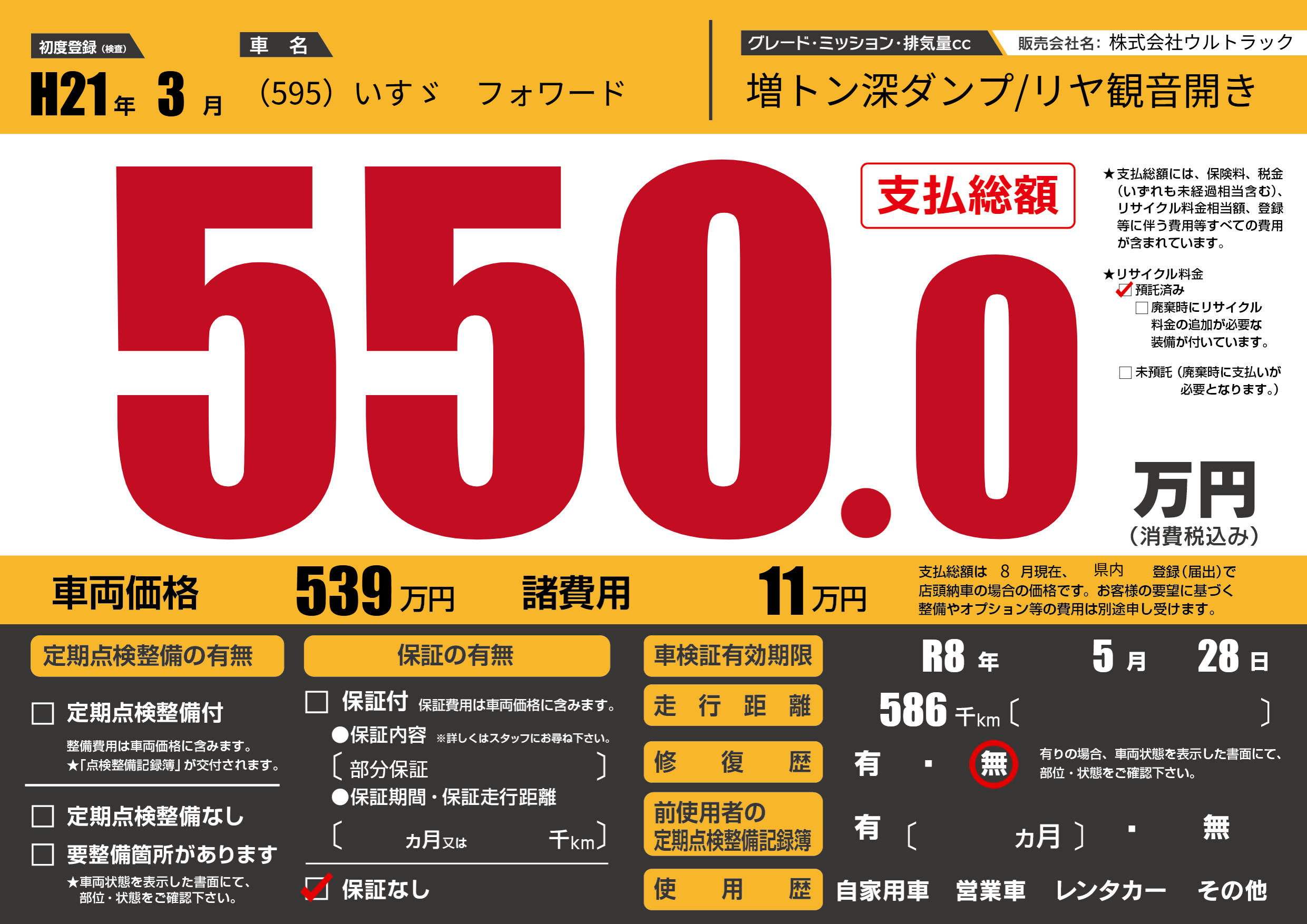 | 走行キロ | 58.6万km | 初年度登録 | H21年3月 |