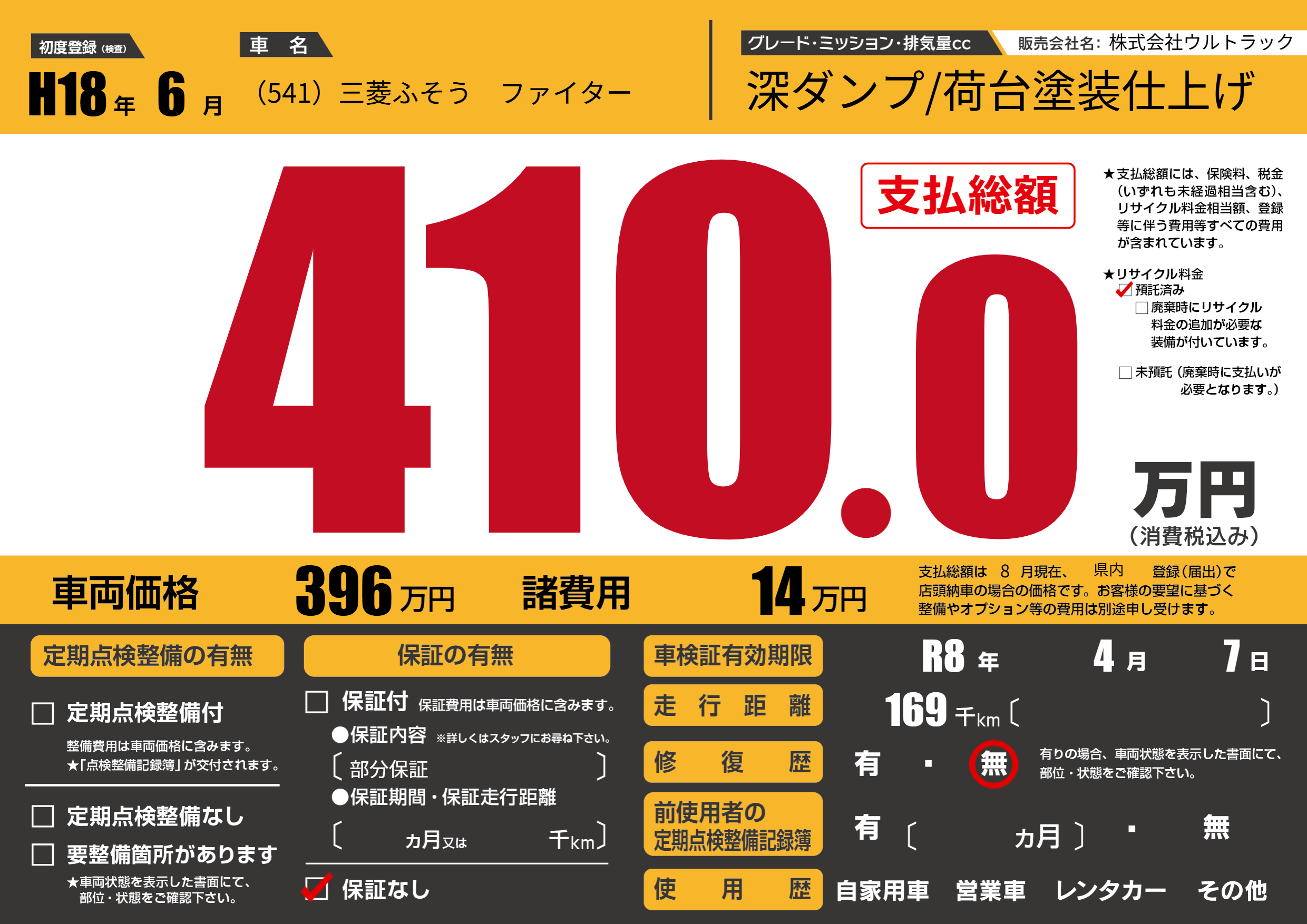 | 車名 | (541)三菱ふそう ファイター | グレード ミッション 排気量 |