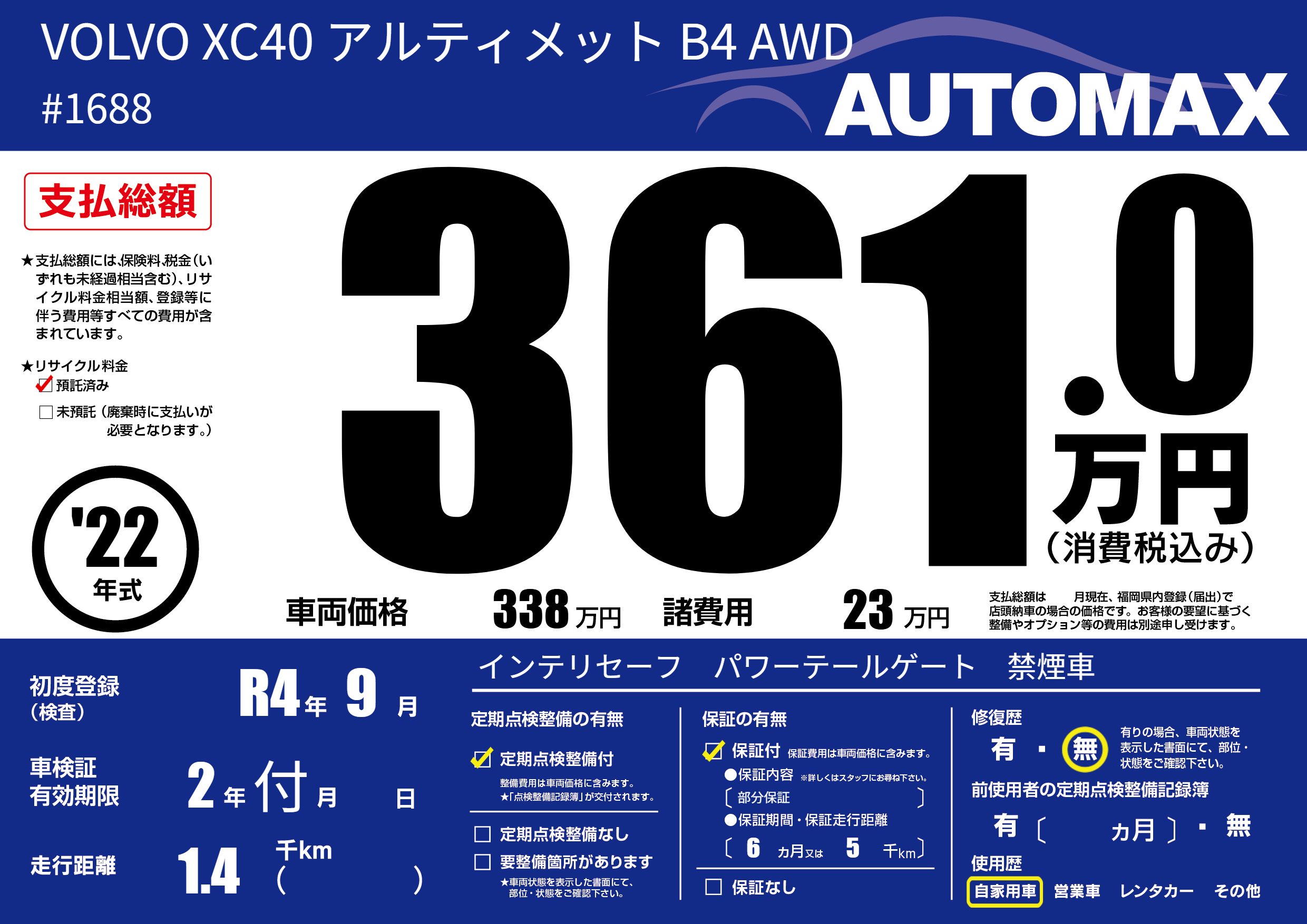 | 車名 | VOLVO XC40 アルティメット B4 AWD | グレード ミッション 排気量 |