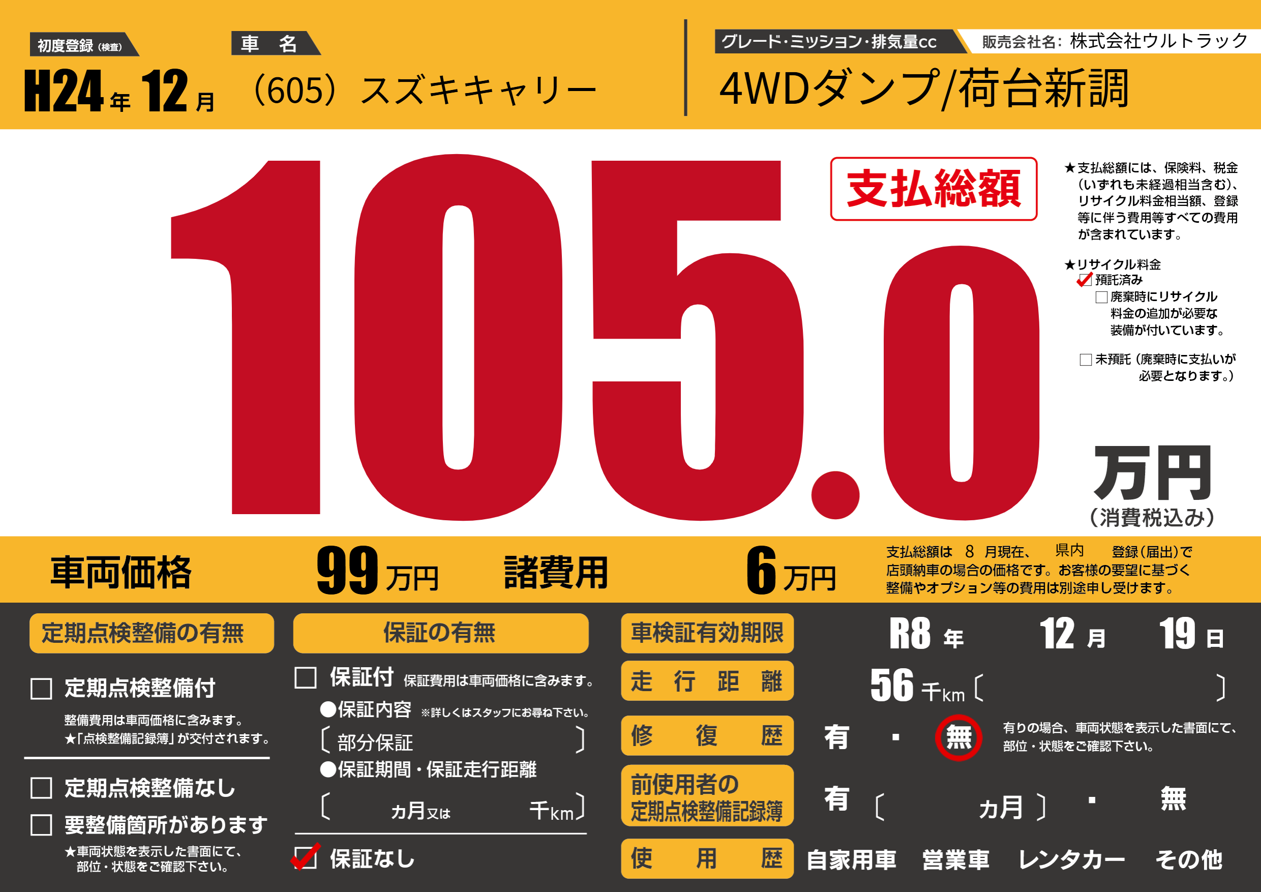 | 車名 | (605)スズキキャリー | グレード ミッション 排気量 |
