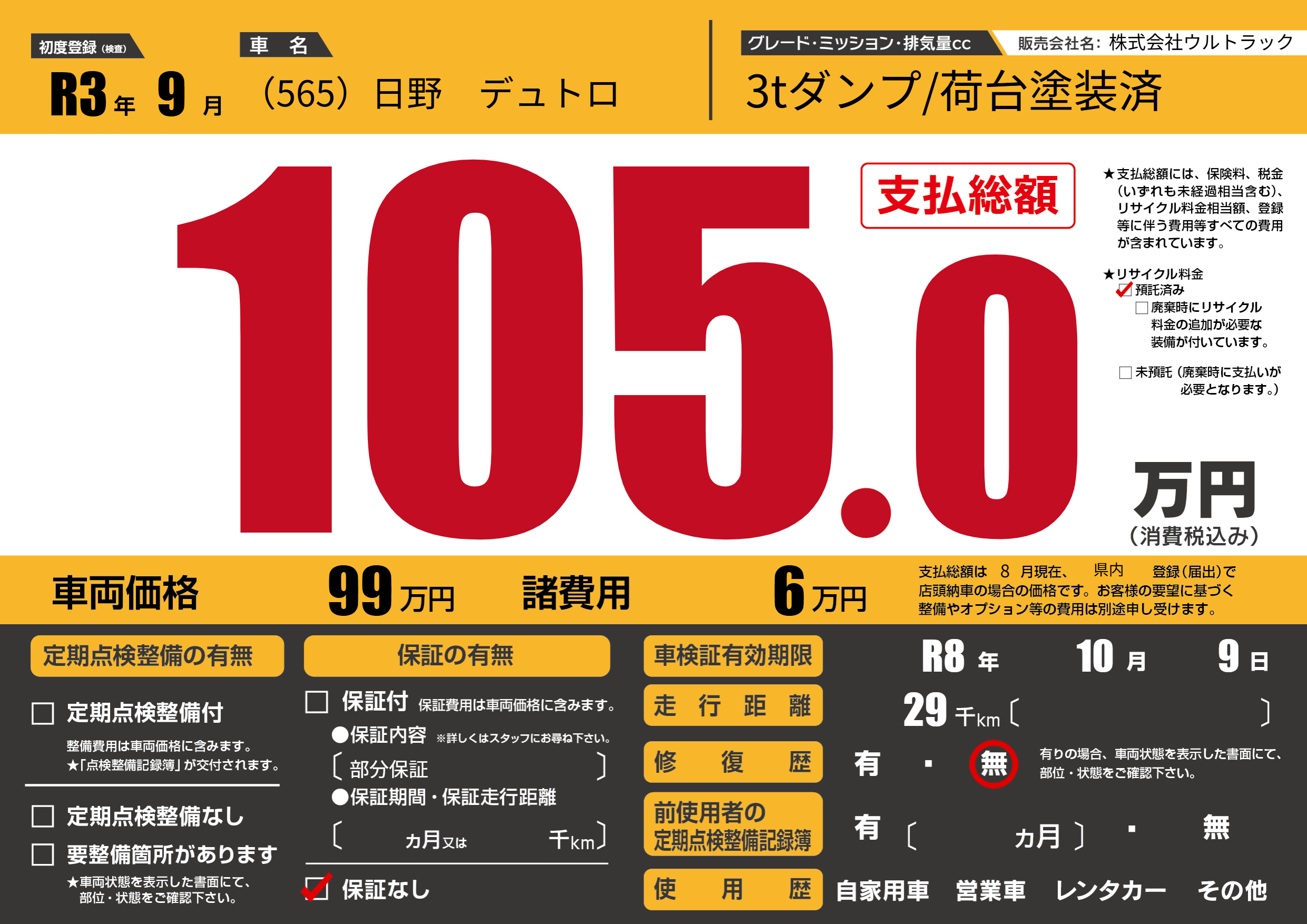 保証なし 保証内容(部分保証) ---ヶ月または()千kmまで |