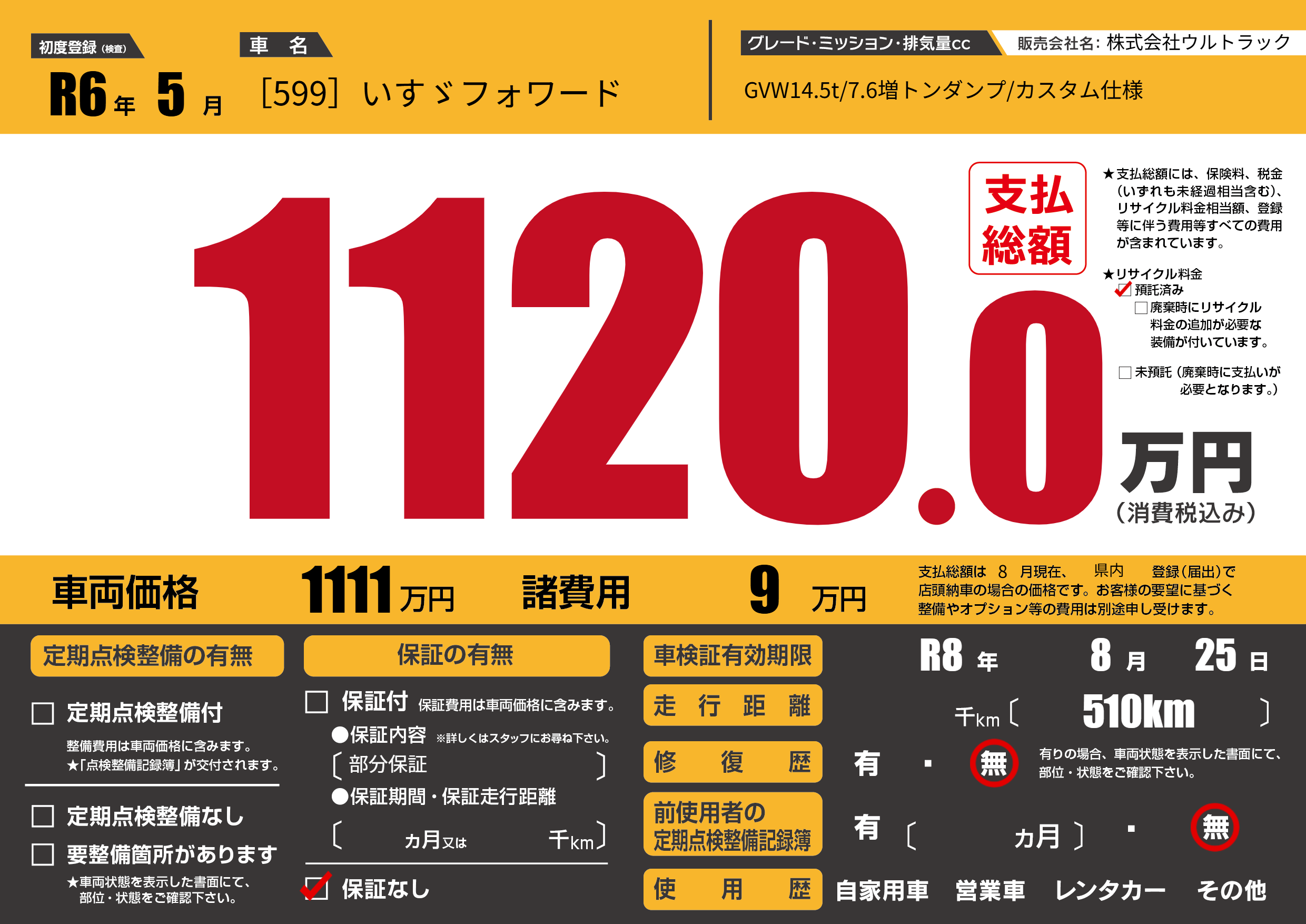 GVW14.5t/7.6増トンダンプ/カスタム仕様 |