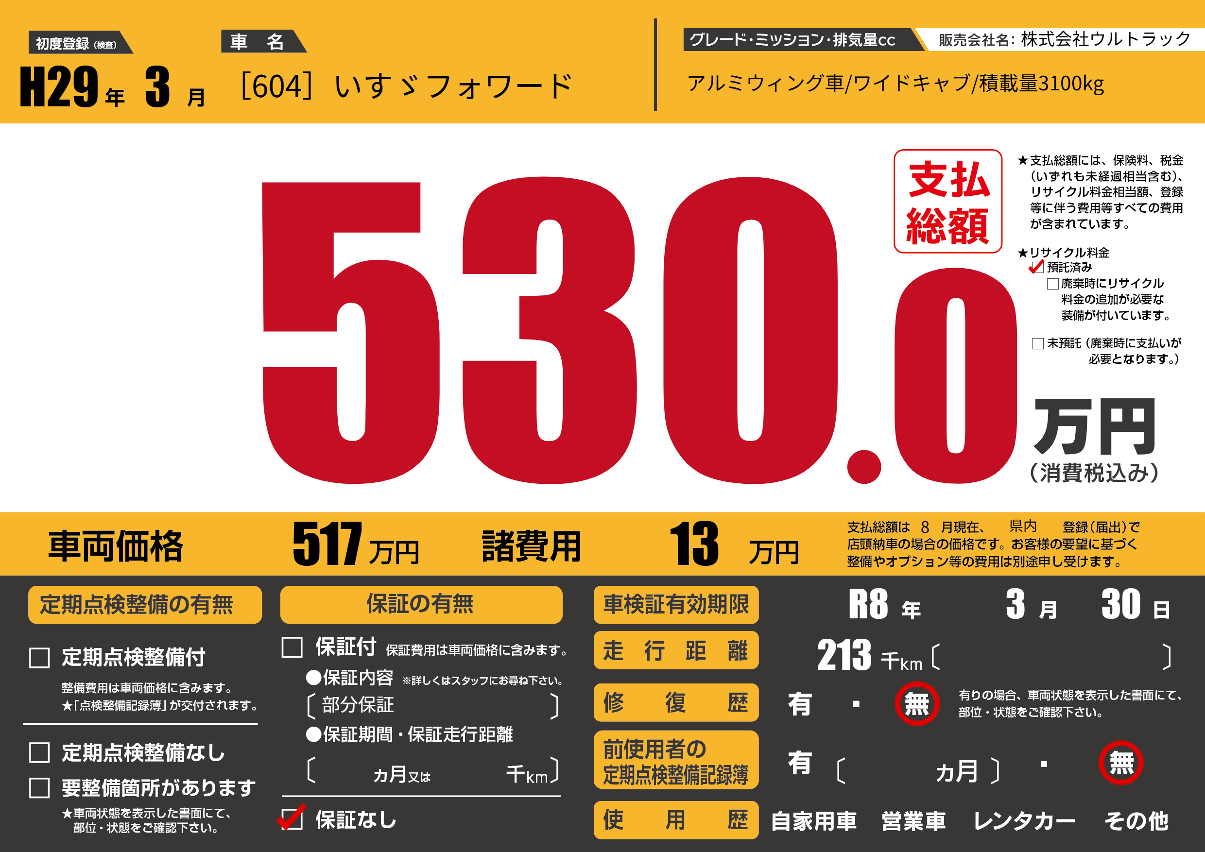保証なし 保証内容(部分保証) ---ヶ月または()千kmまで |