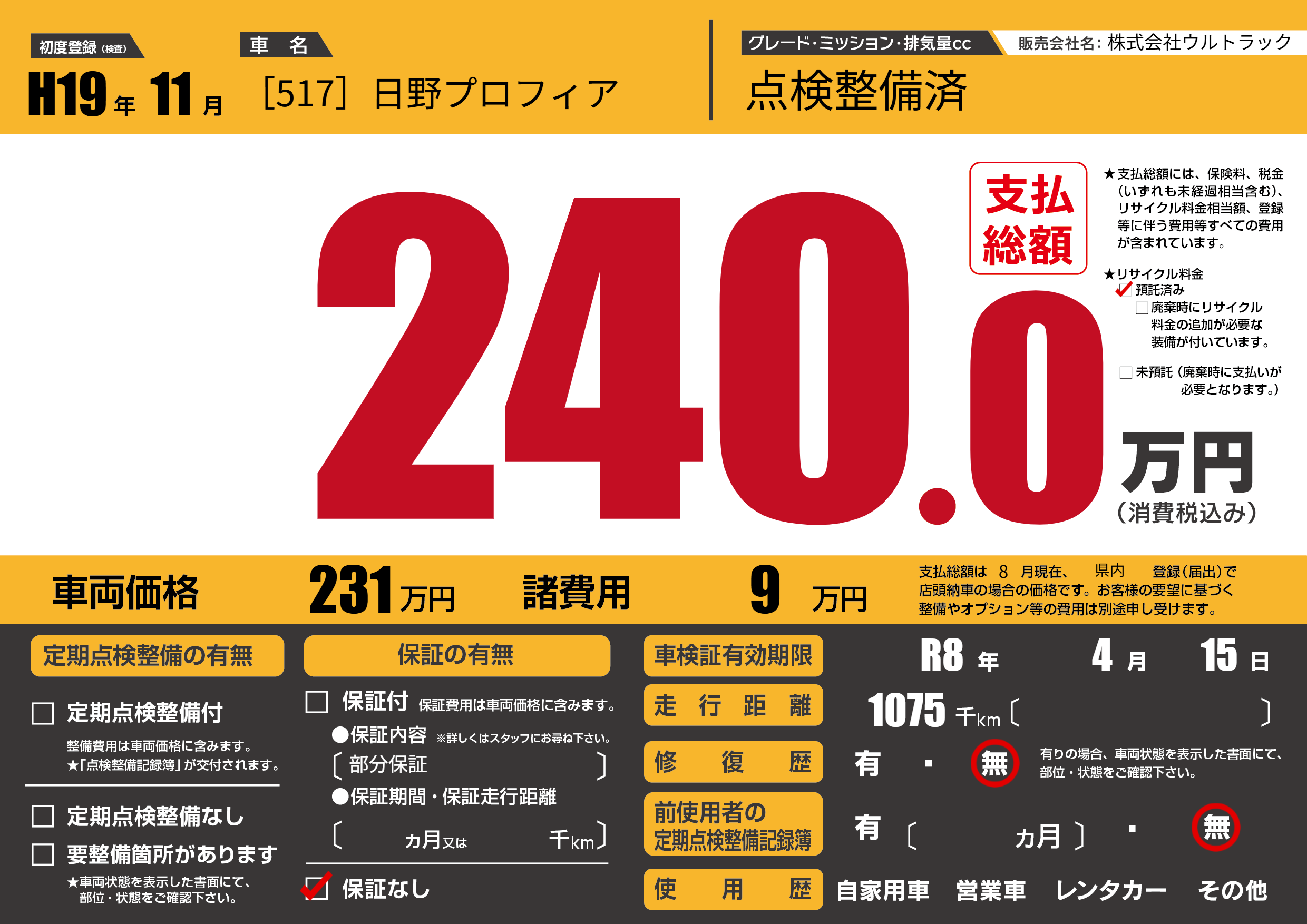 | 走行キロ | 107.5万km | 初年度登録 | H19年11月 |