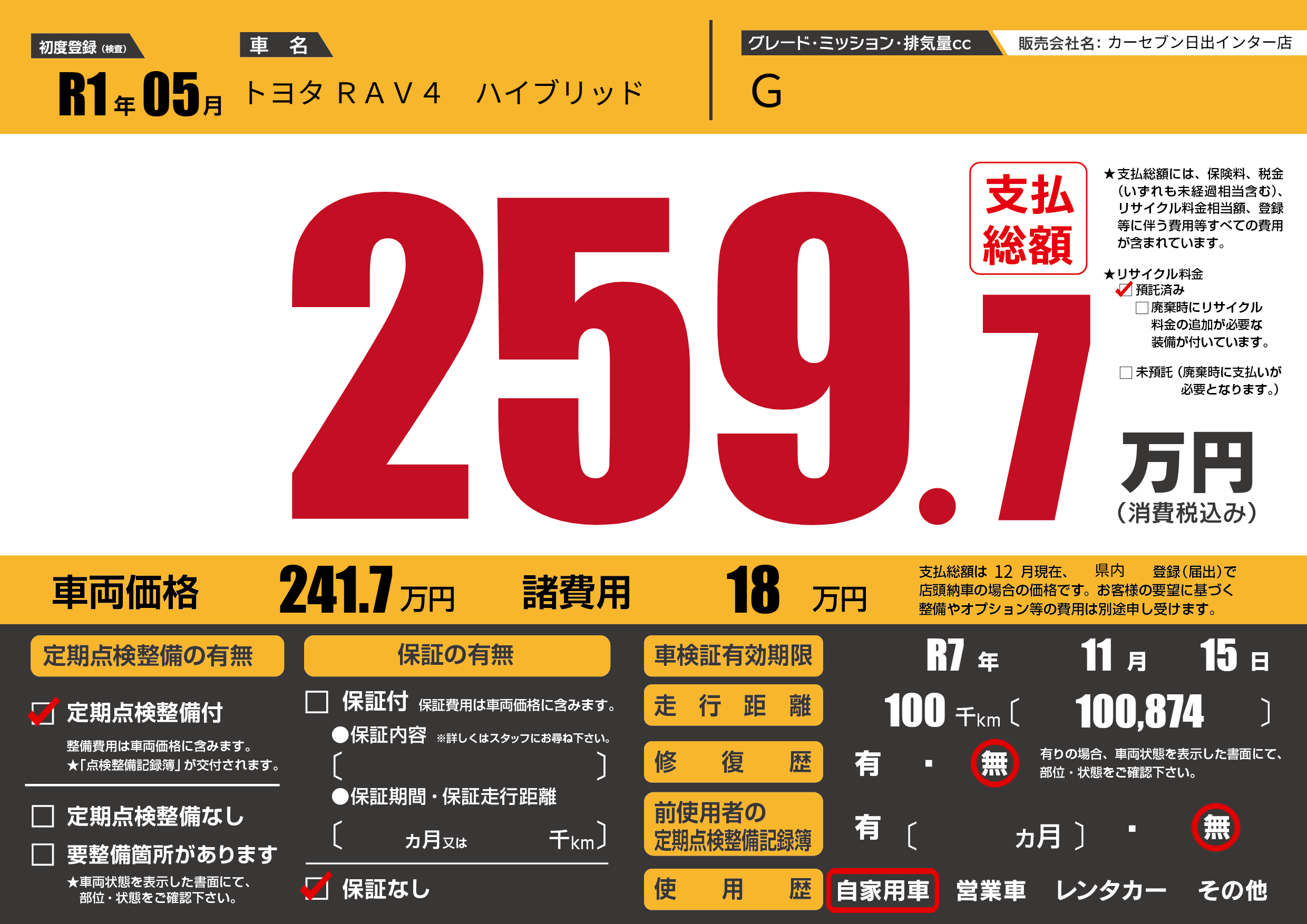 | 車名 | トヨタ RAV4 ハイブリッド | グレード ミッション 排気量 |
