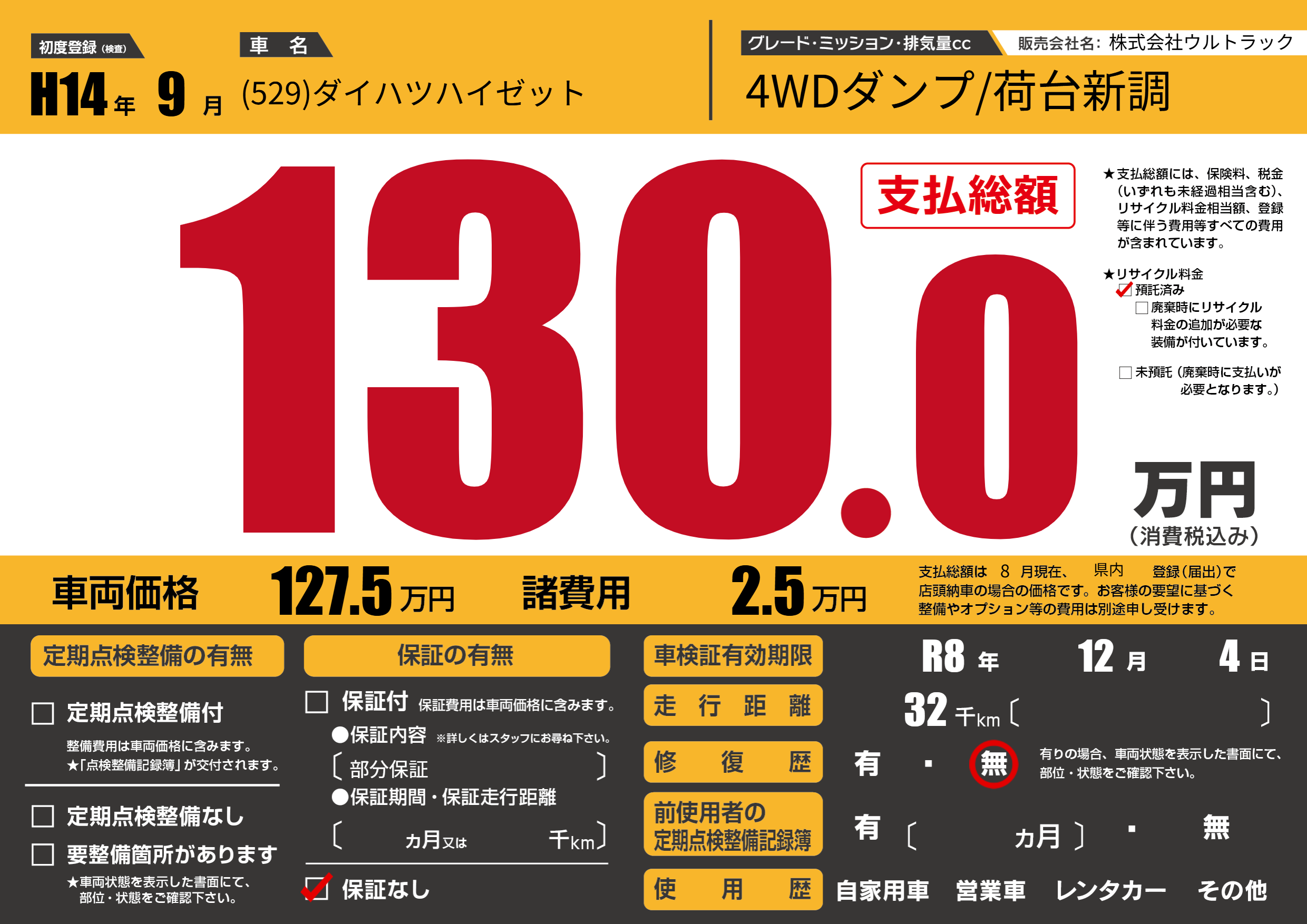 | 走行キロ | 3.2万km | 初年度登録 | H14年9月 |