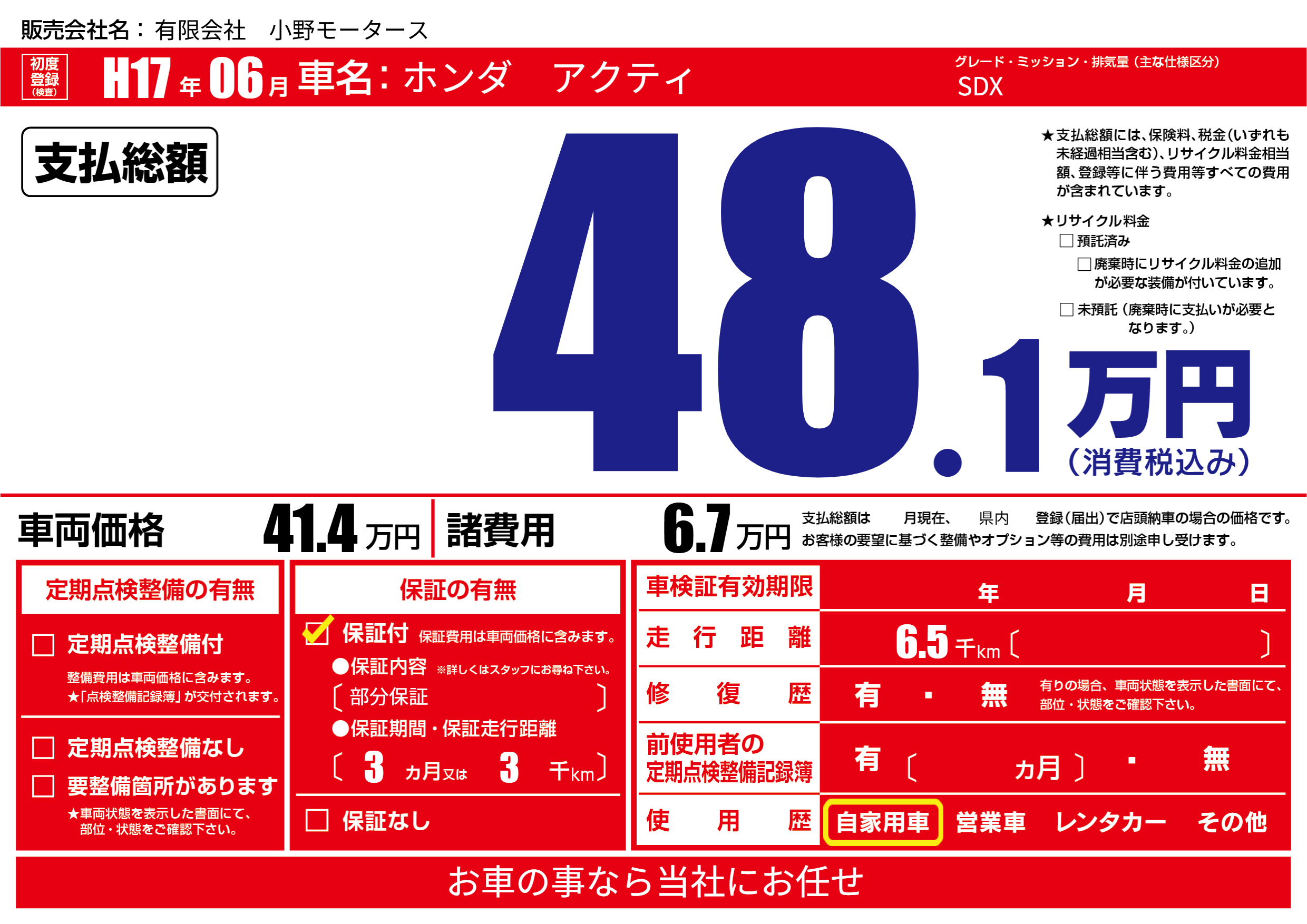 | 走行キロ | 0.6万km | 初年度登録 | H17年06月 |