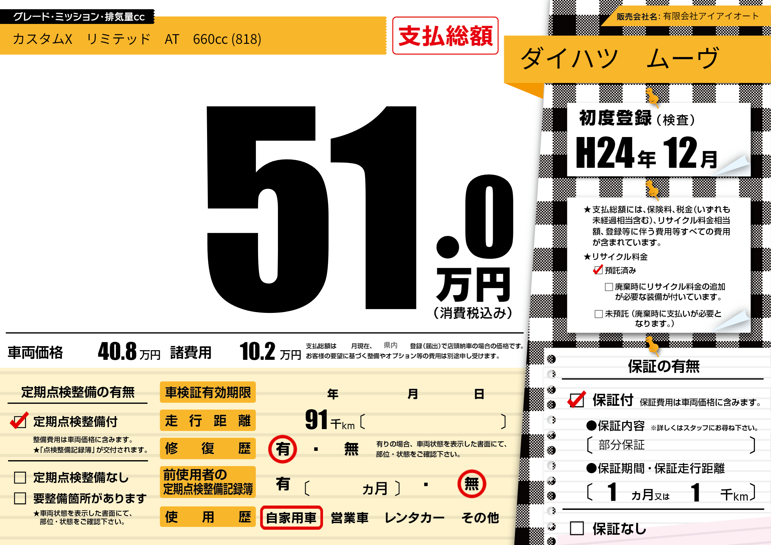 | 走行キロ | 9.1万km | 初年度登録 | H24年12月 |