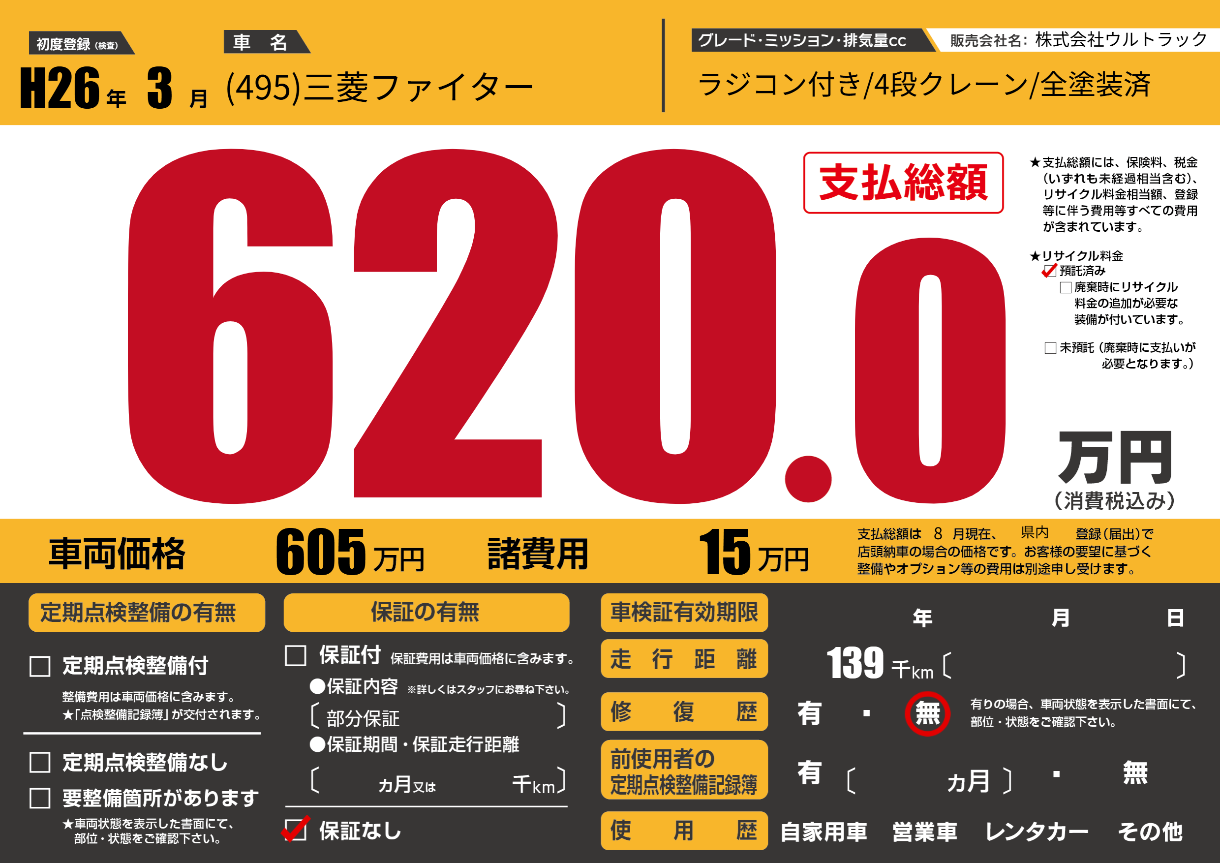 | 走行キロ | 13.9万km | 初年度登録 | H26年3月 |
