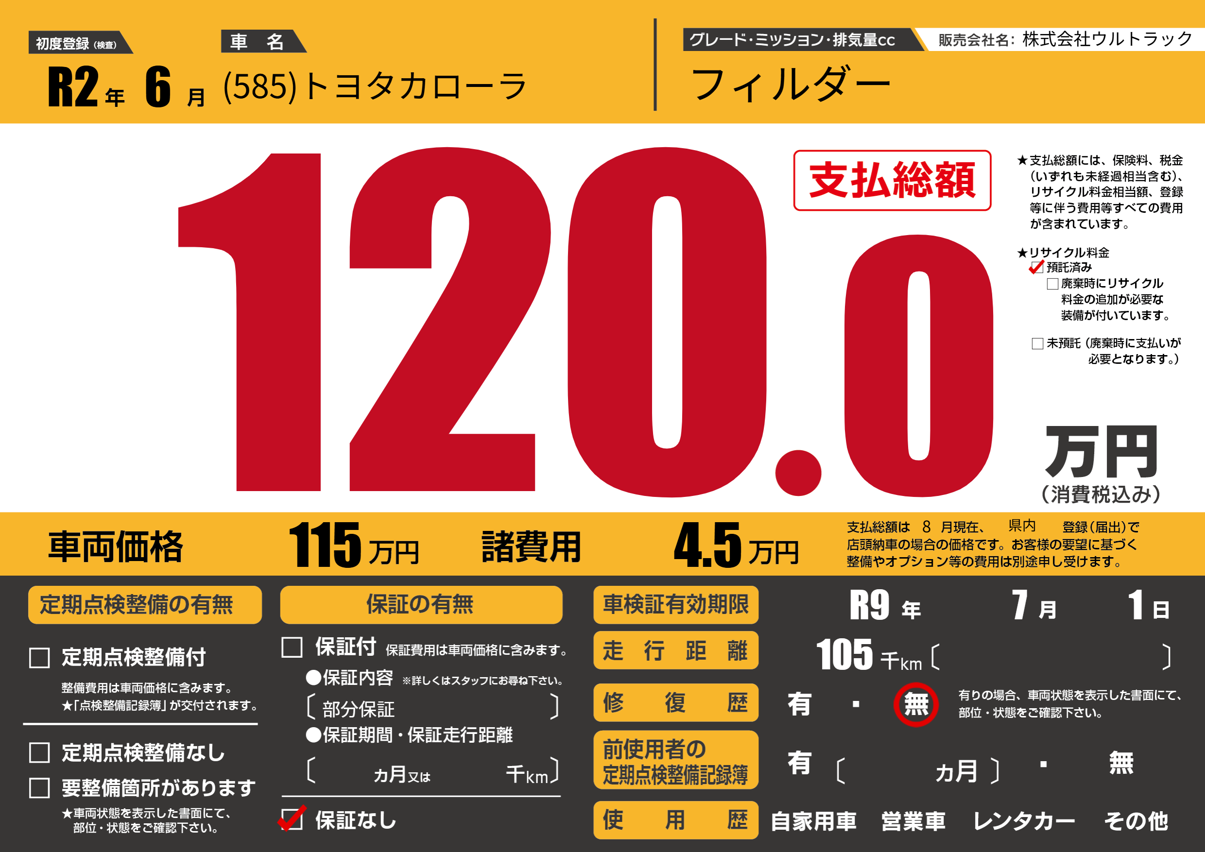 | 走行キロ | 10.5万km | 初年度登録 | R2年6月 |