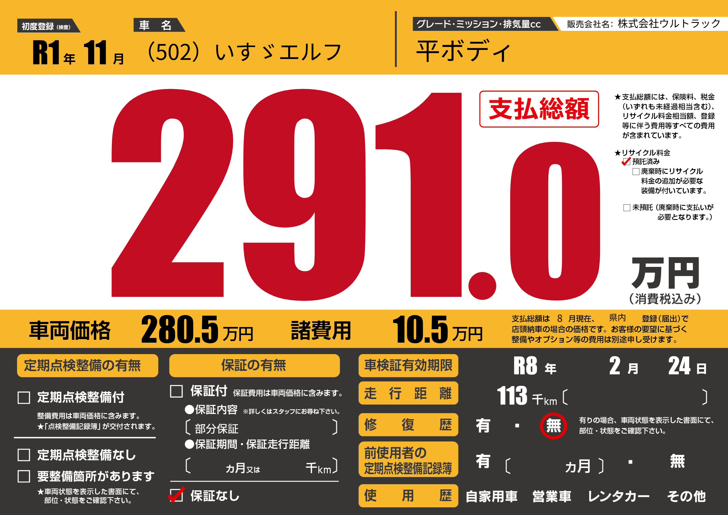 | 走行キロ | 11.3万km | 初年度登録 | R1年11月 |