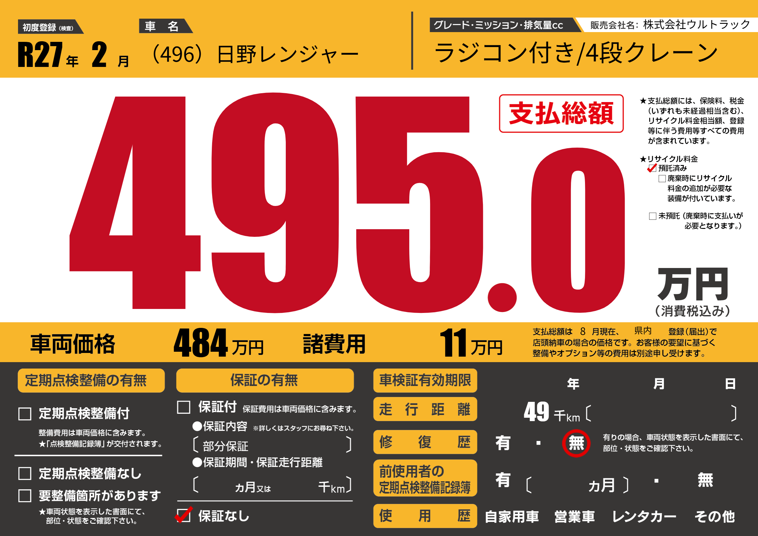 | 車名 | (496)日野レンジャー | グレード ミッション 排気量 |