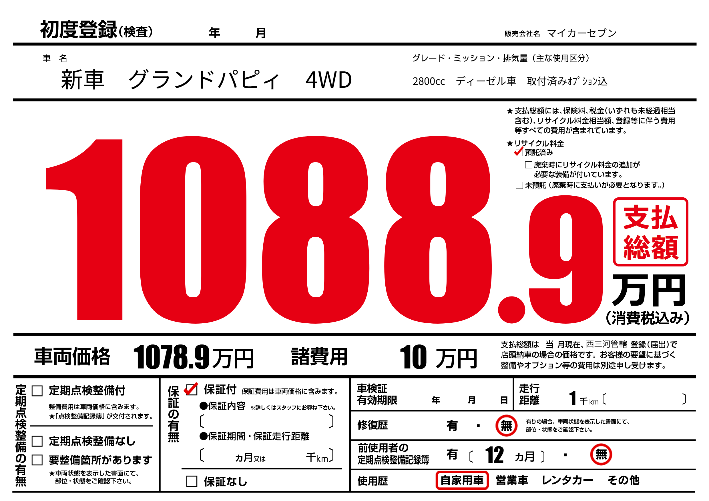 | 車名 | 新車 グランドパピィ 4WD | グレード ミッション 排気量 |
