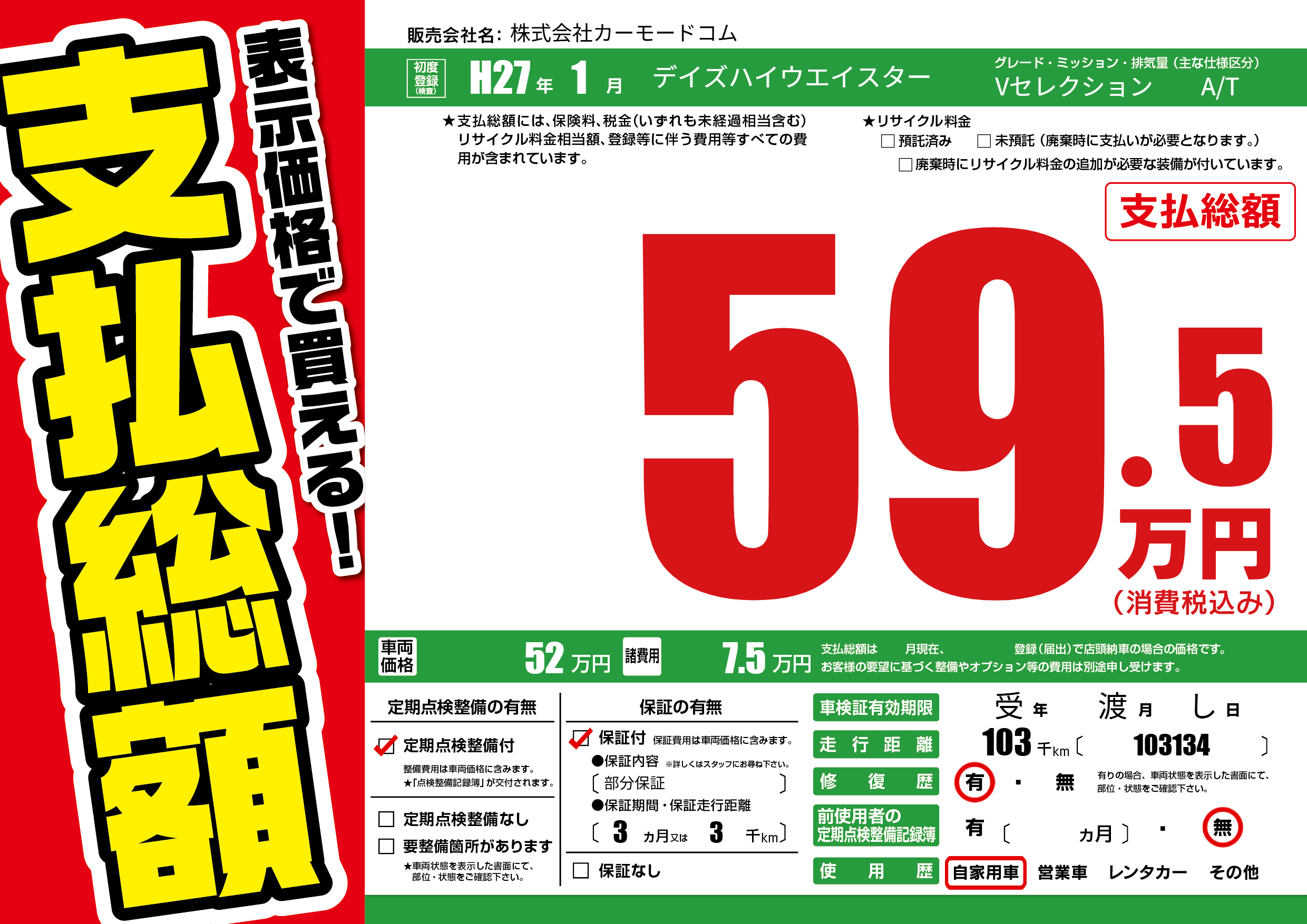 | 走行キロ | 10.3万km | 初年度登録 | H27年1月 |