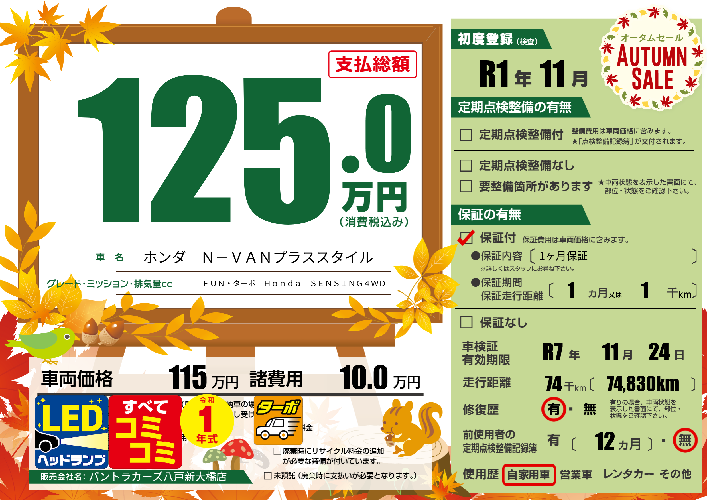 | 車名 | ホンダ N-VANプラススタイル | グレード ミッション 排気量 |