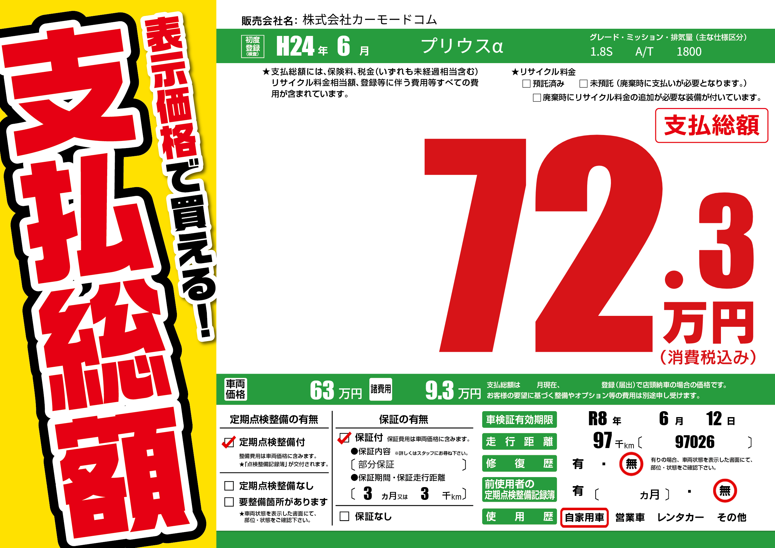 保証付き 保証内容(部分保証) 3ヶ月または(3)千kmまで |