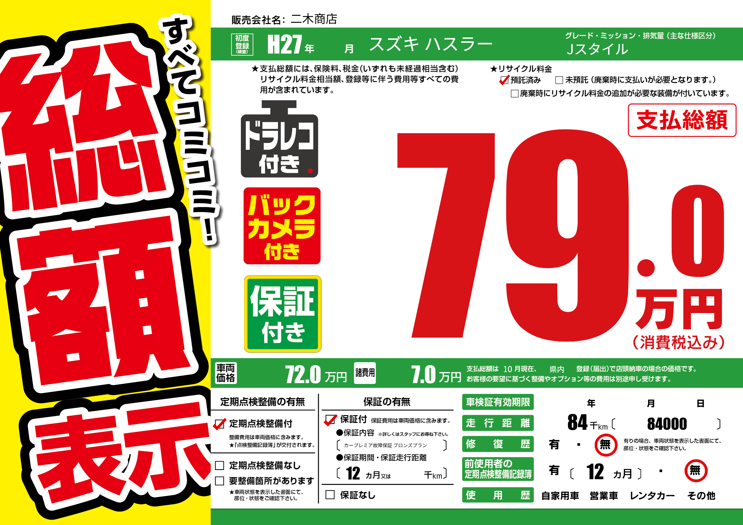 | 車名 | スズキ ハスラー | グレード ミッション 排気量 |