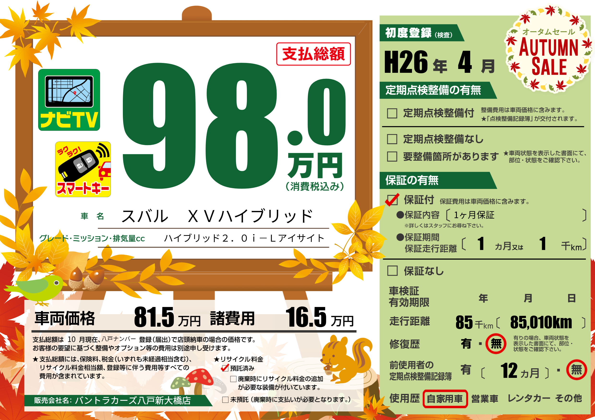 | 車名 | スバル XVハイブリッド | グレード ミッション 排気量 |