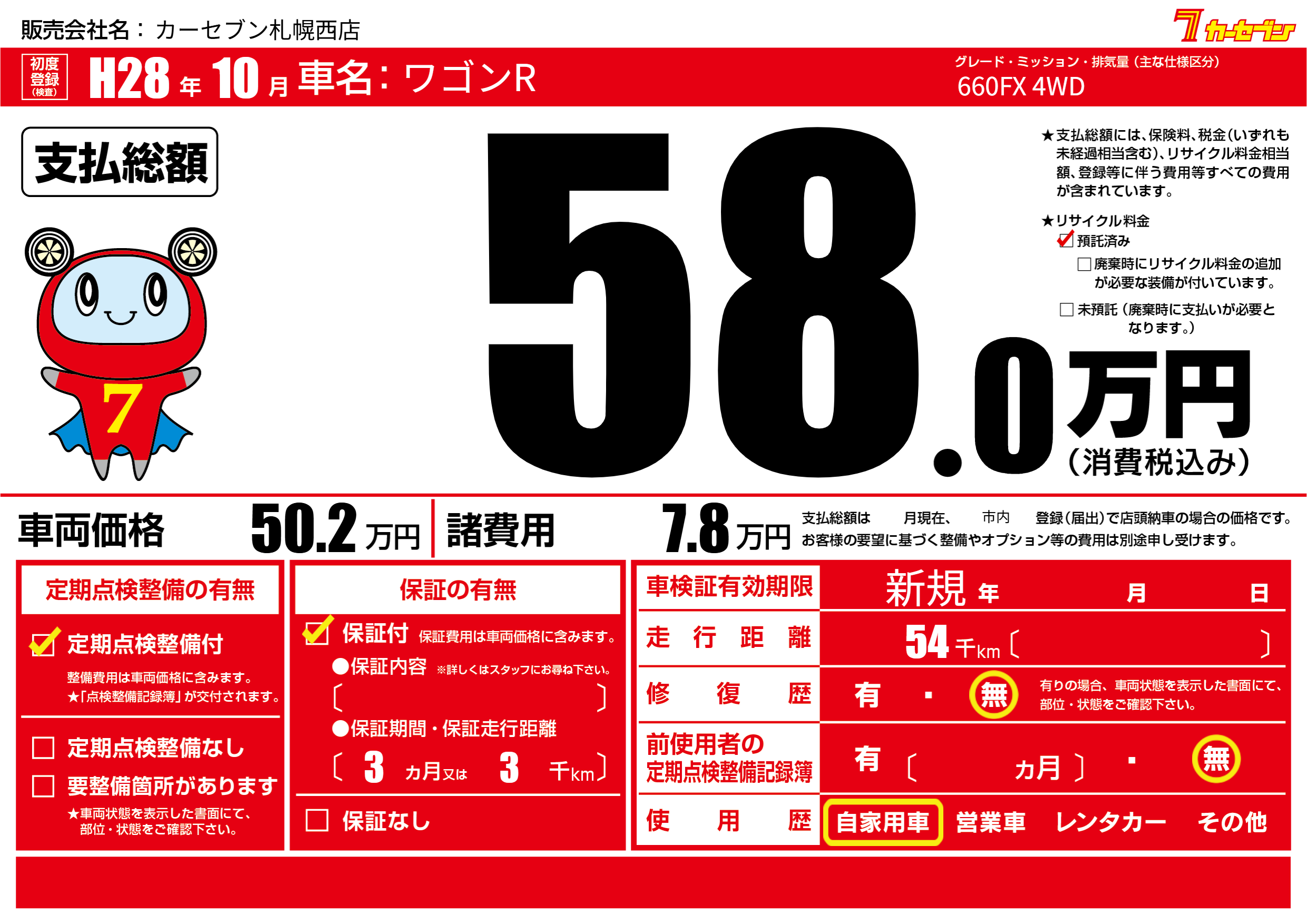 | 車名 | ワゴンR | グレード ミッション 排気量 |
