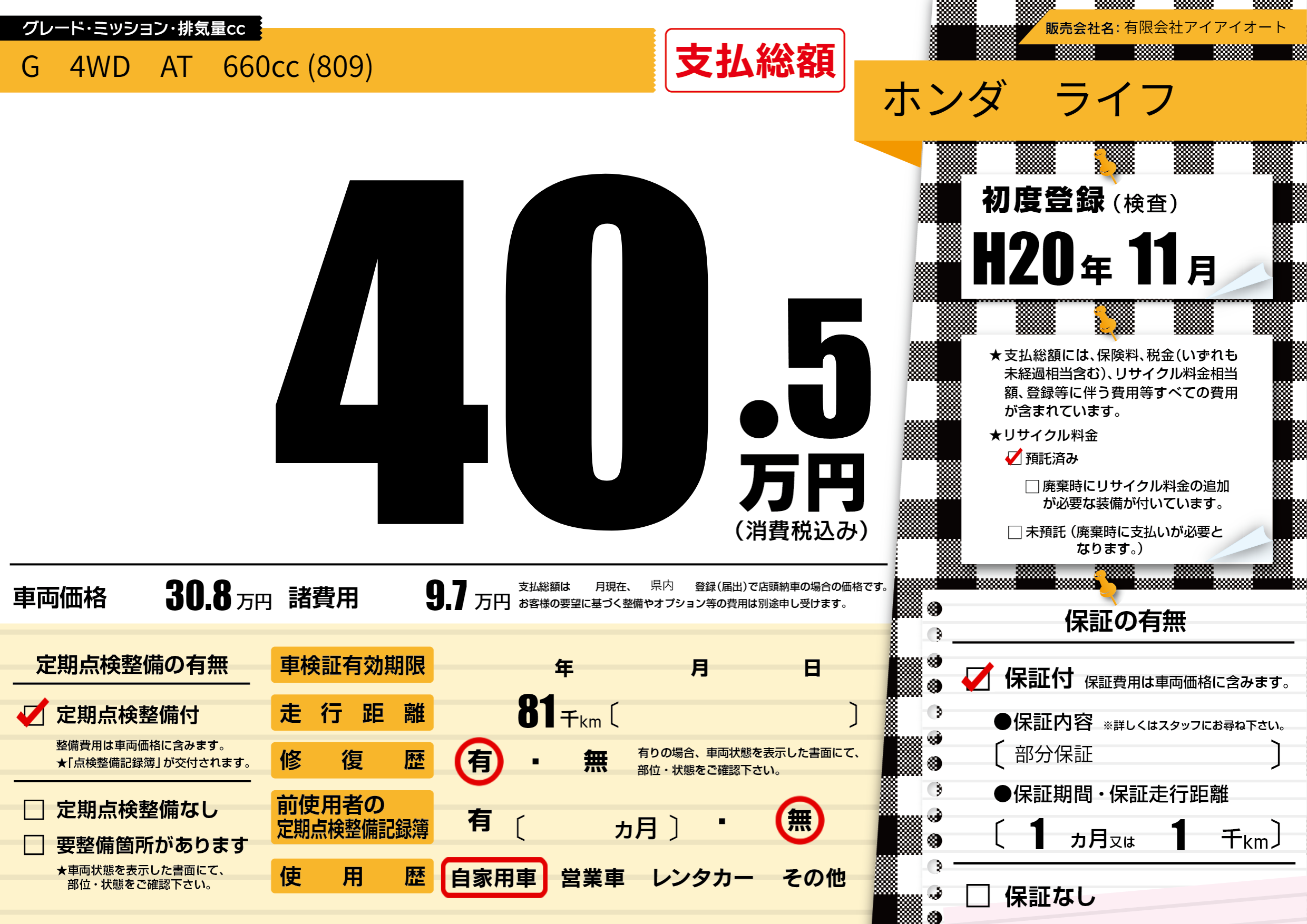 | 車名 | ホンダ ライフ | グレード ミッション 排気量 |