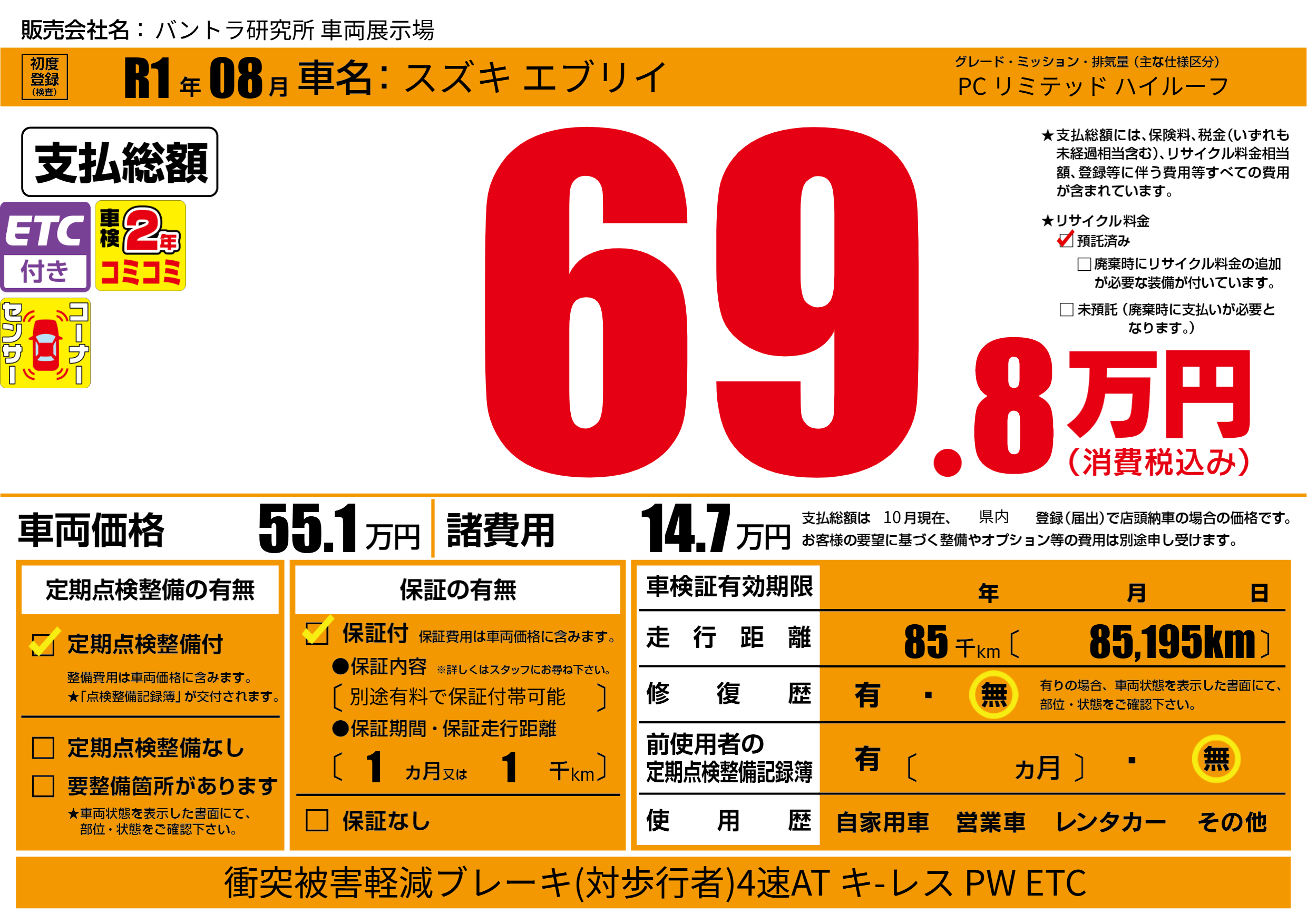 | 車名 | スズキ エブリイ | グレード ミッション 排気量 |