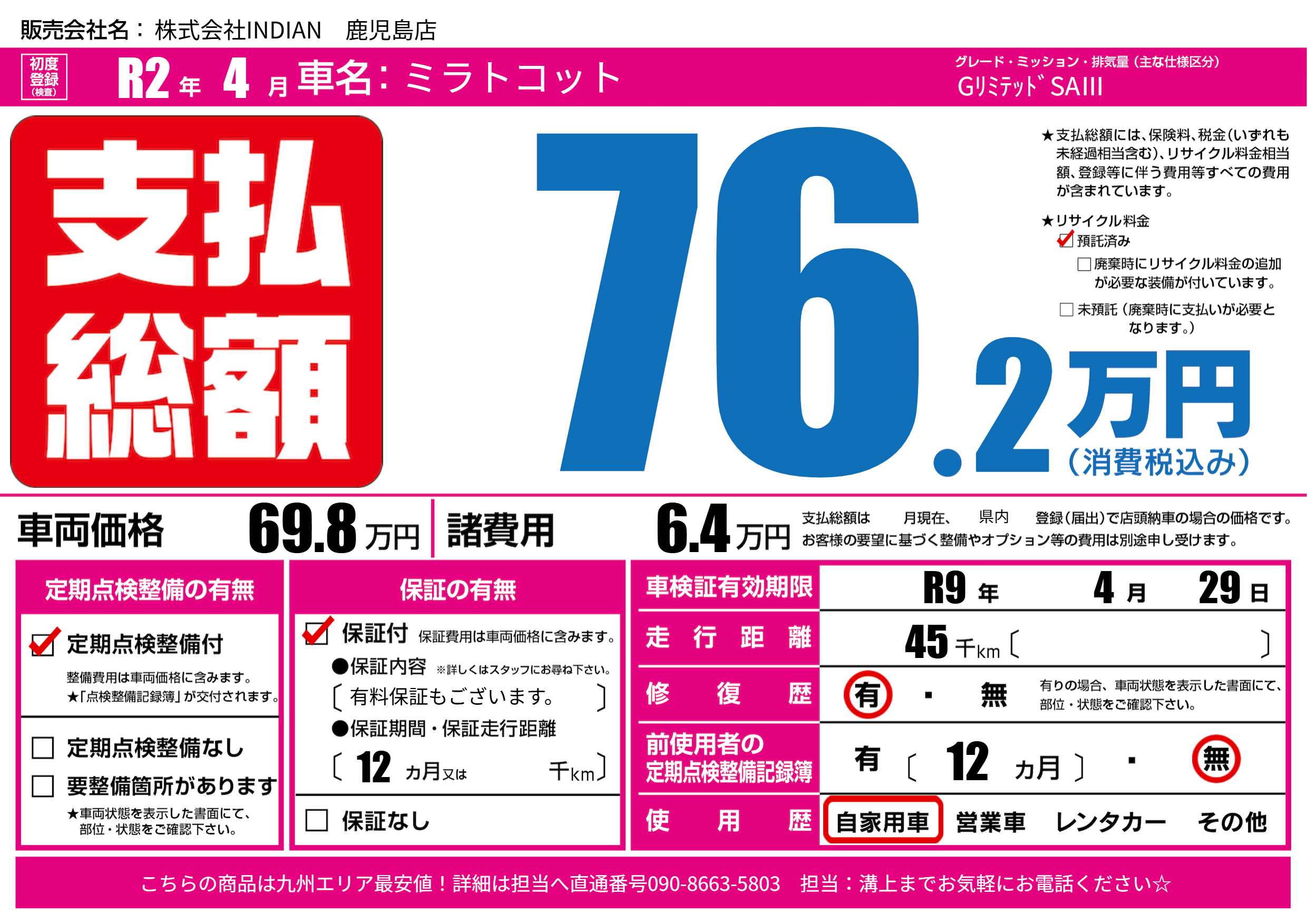 | 車名 | ミラトコット | グレード ミッション 排気量 |