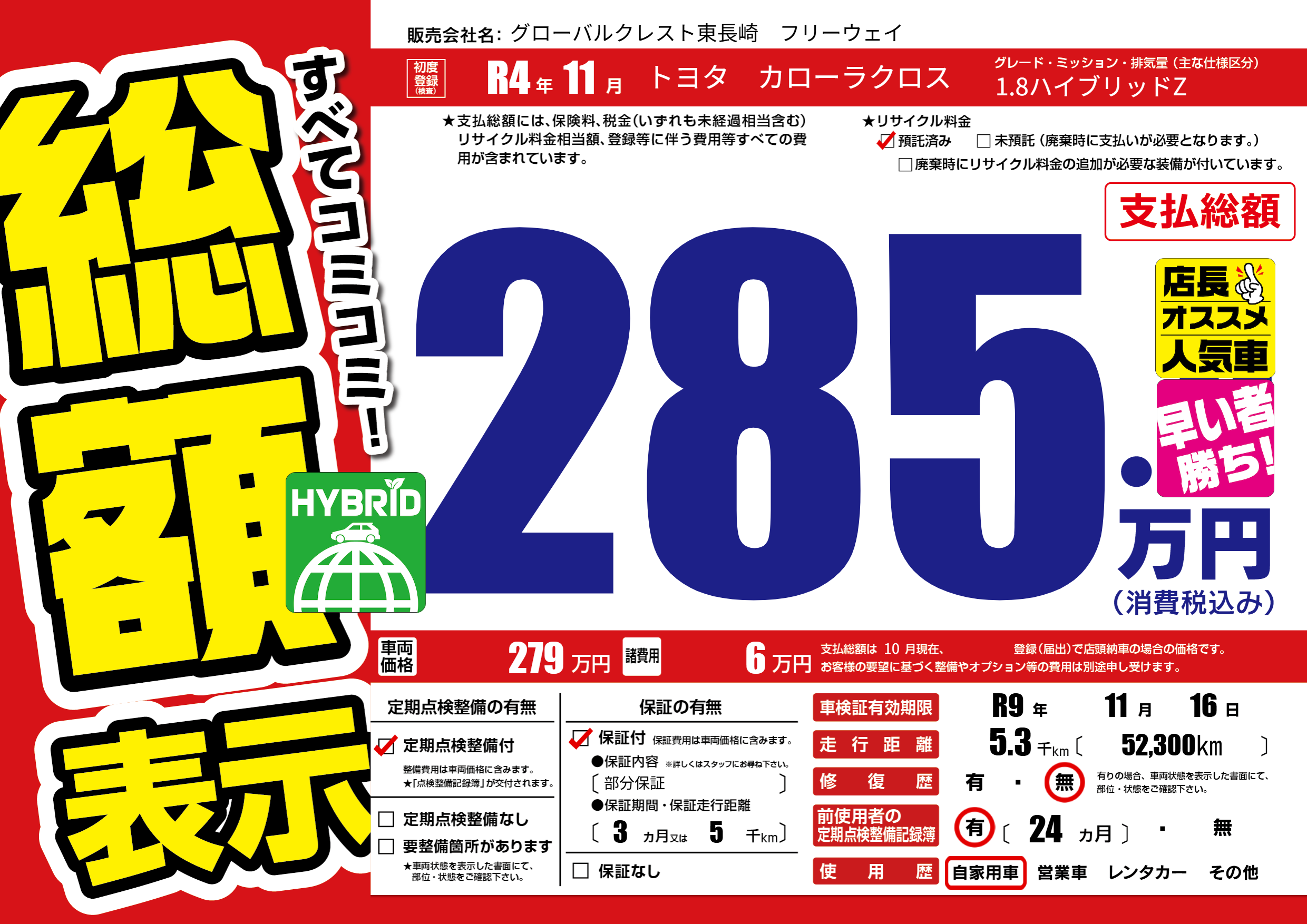 | 車名 | トヨタ カローラクロス | グレード ミッション 排気量 |