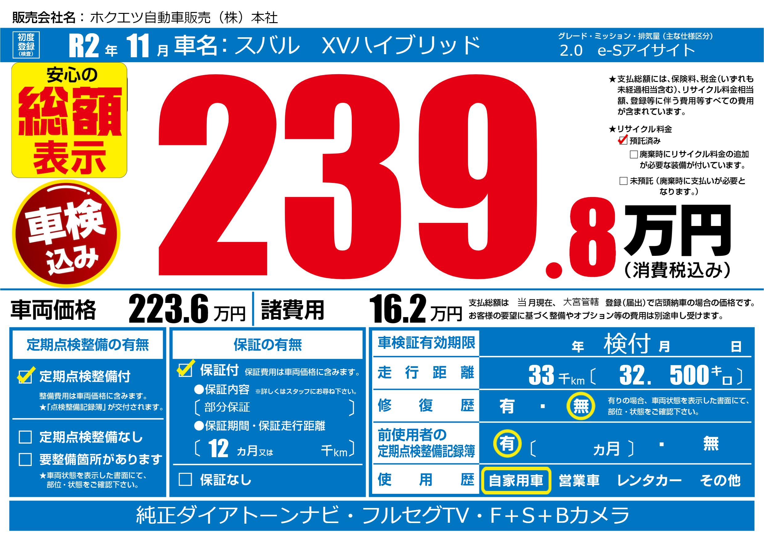 | 走行キロ | 3.3万km | 初年度登録 | R2年11月 |