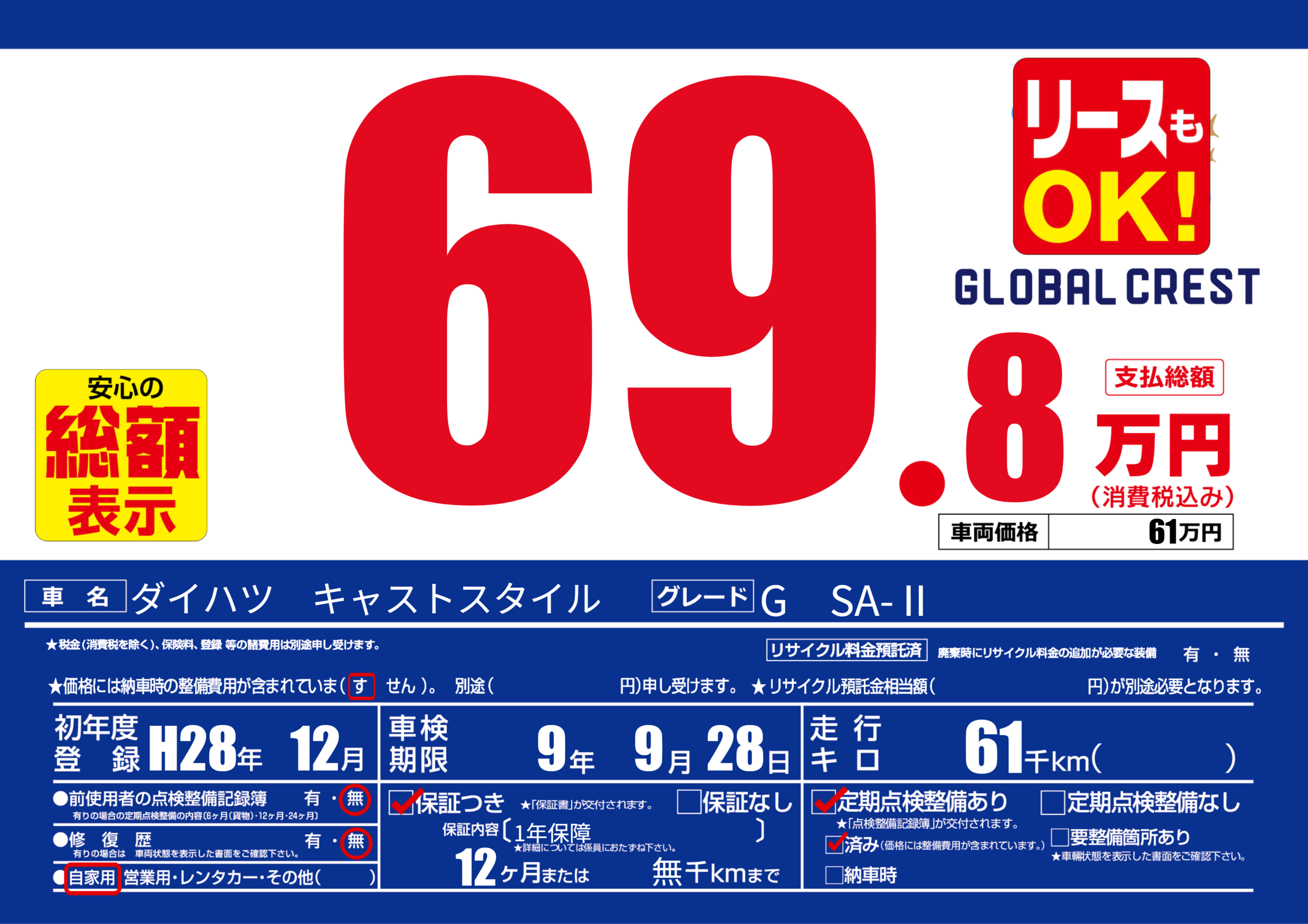 | 定期点検整備 | 定期点検整備あり 定期点検整備済み | ||