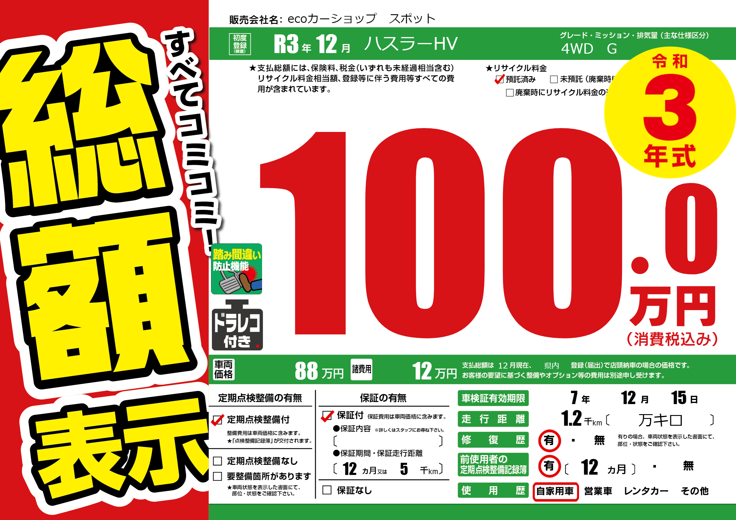 | 車名 | ハスラーHV | グレード ミッション 排気量 |
