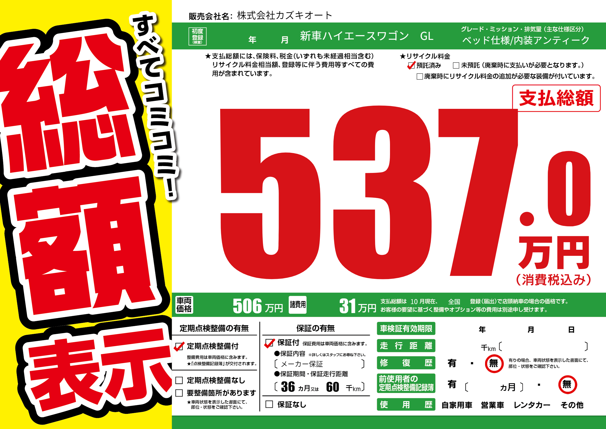 | 車名 | 新車ハイエースワゴン GL | グレード ミッション 排気量 |