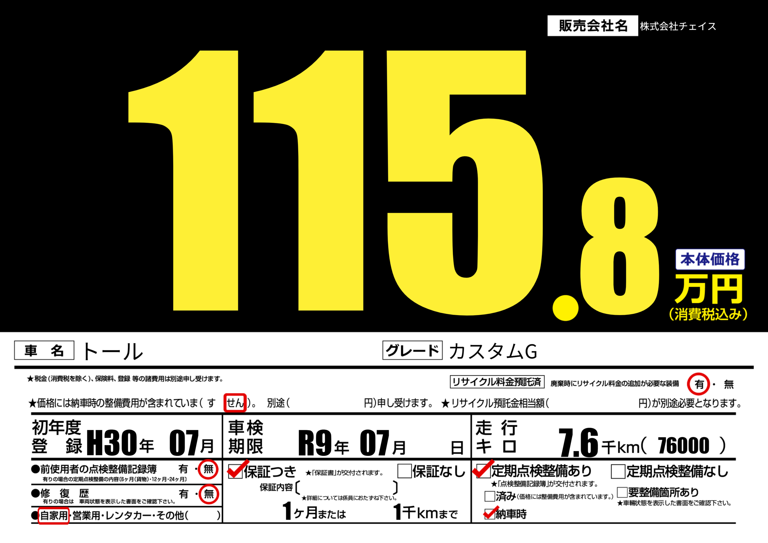 | 定期点検整備 | 定期点検整備あり 納車時あり | ||