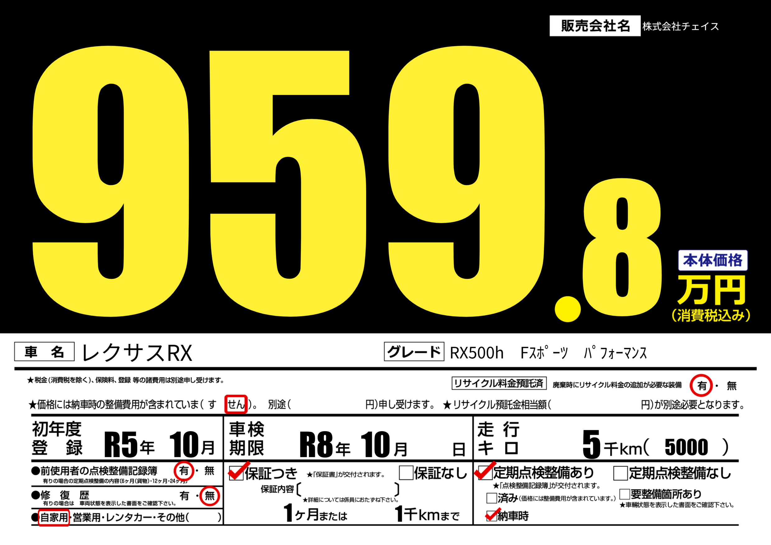| 走行キロ | 0.5万km | 初年度登録 | R5年10月 |