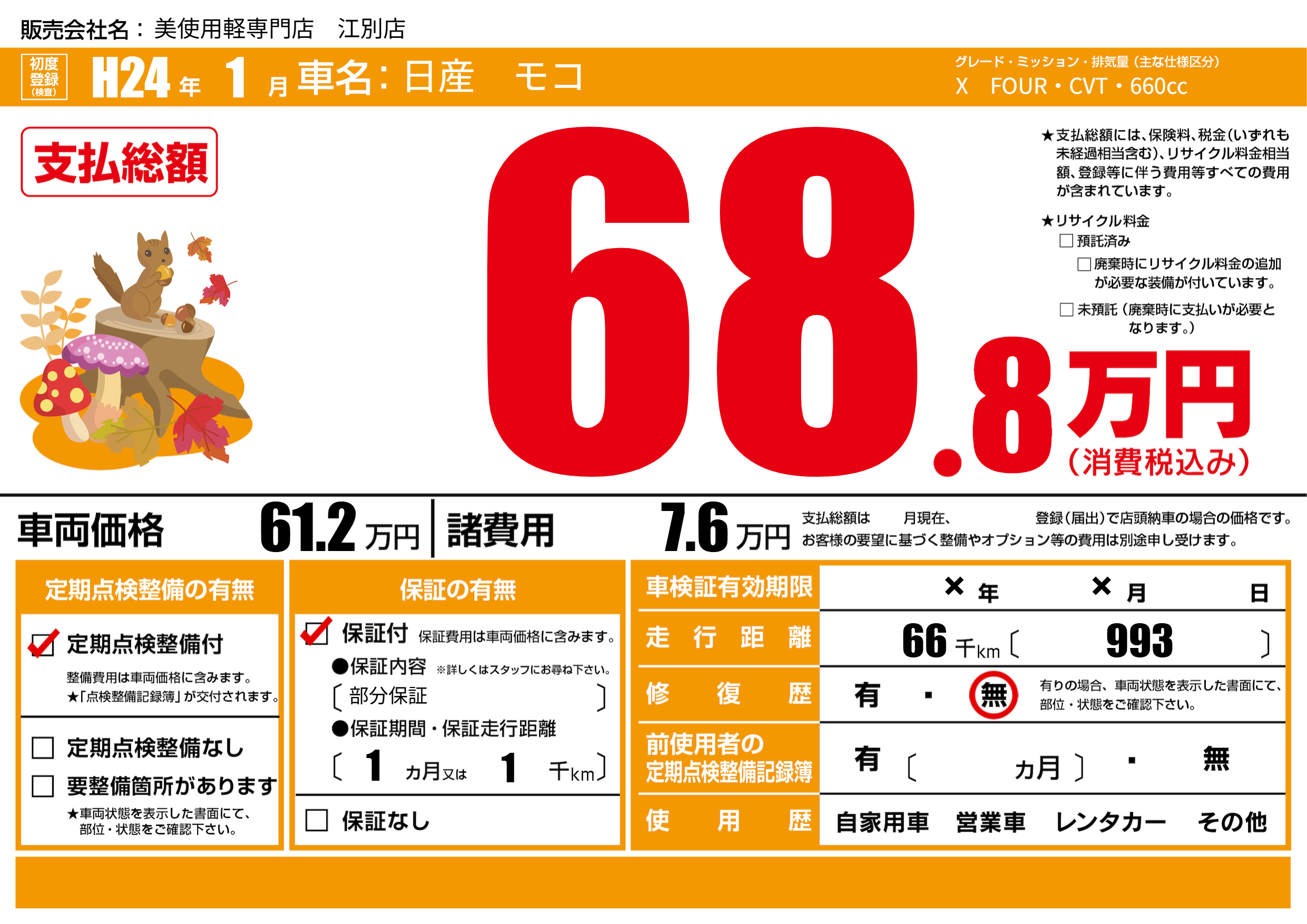 | 車名 | 日産 モコ | グレード ミッション 排気量 |