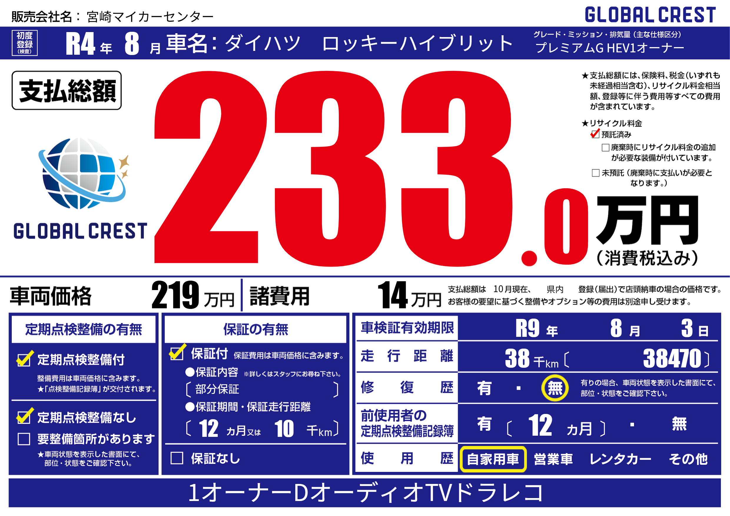 なし | 車検制限 | R9年8月3月 |