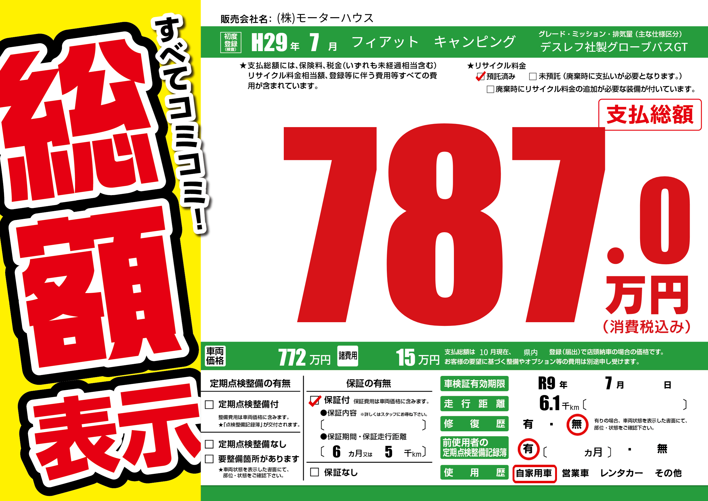 | 車名 | フィアット キャンピング | グレード ミッション 排気量 |