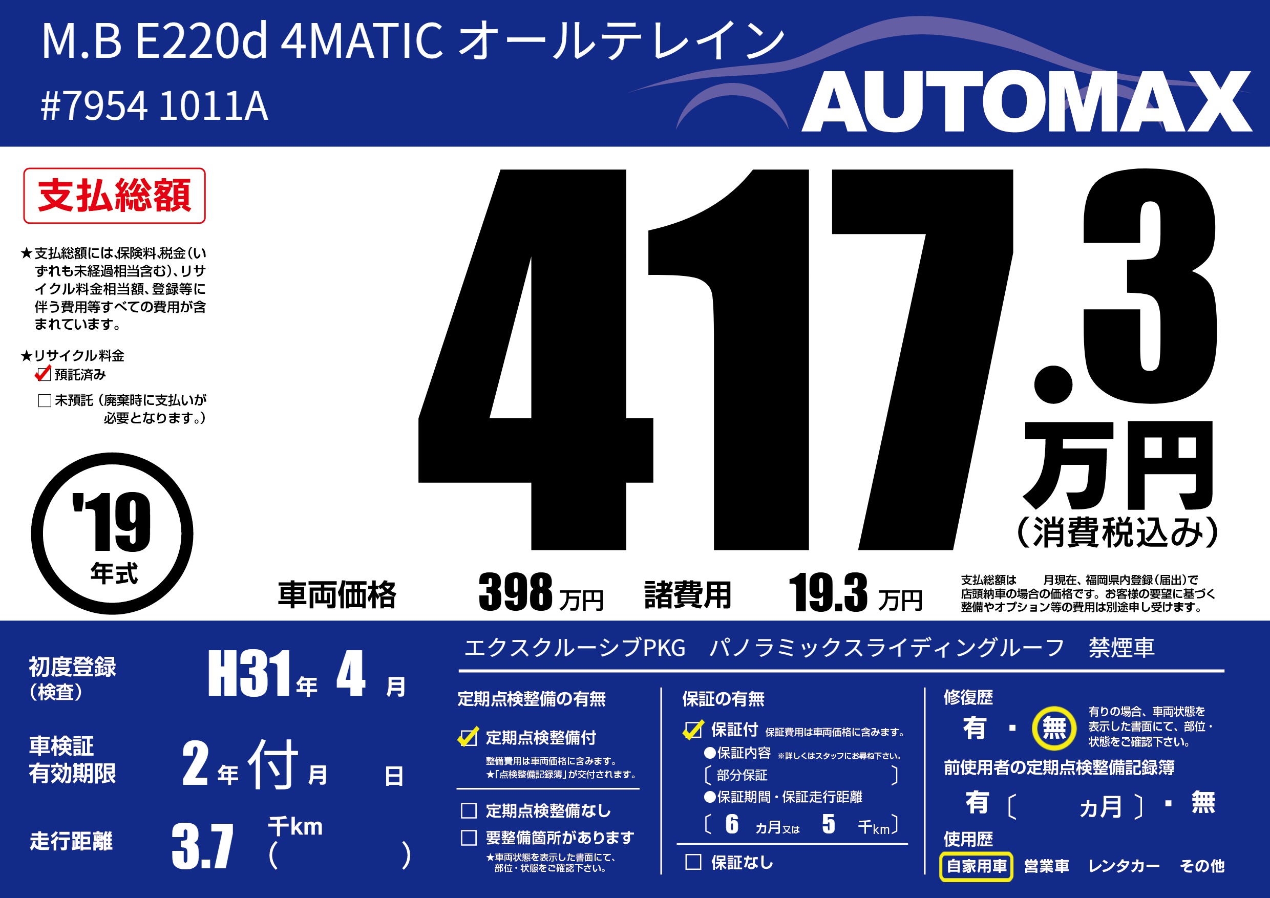 | 車名 | M.B E220d 4MATIC オールテレイン | グレード ミッション 排気量 |