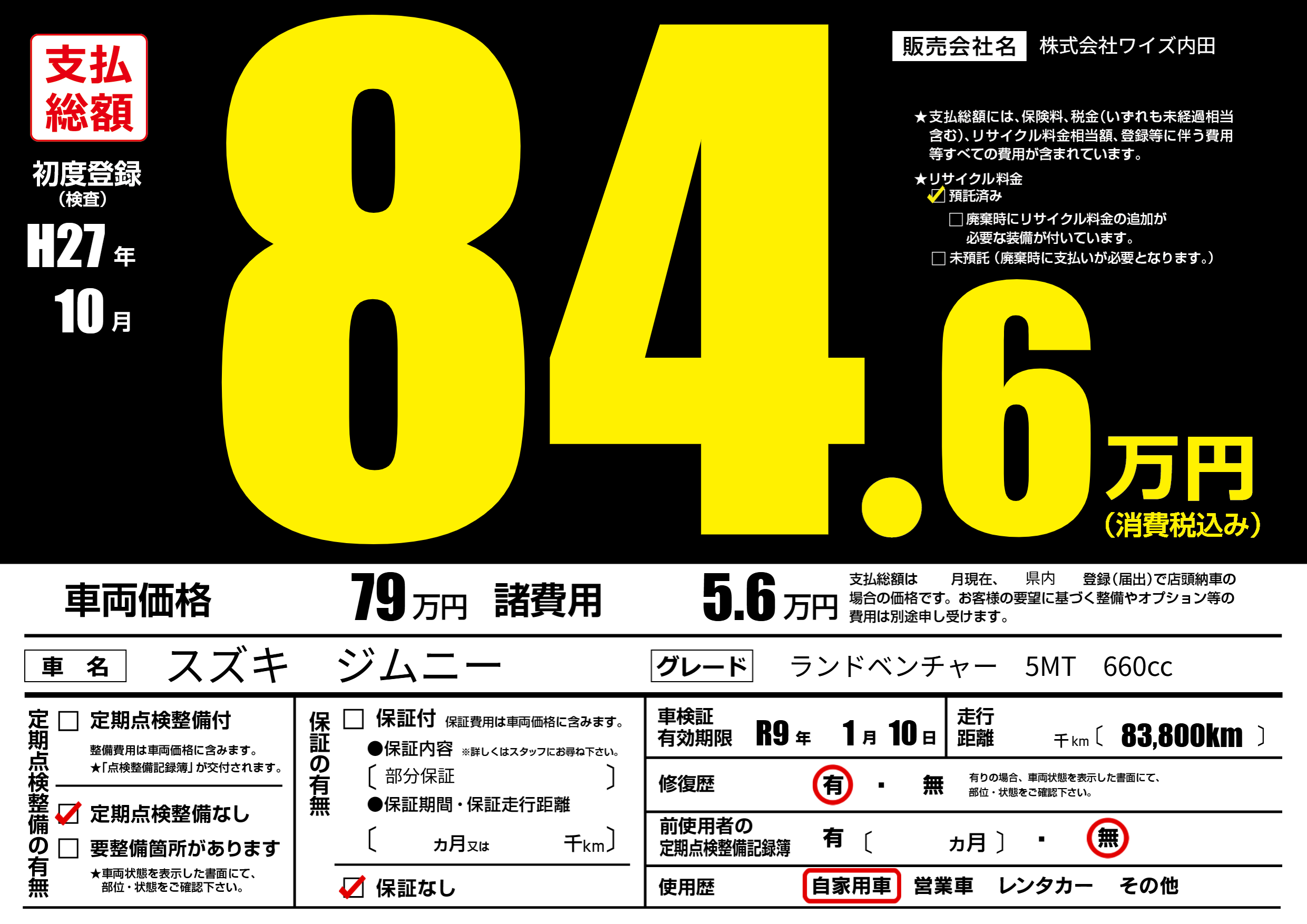 | 車名 | スズキ ジムニー | グレード ミッション 排気量 |