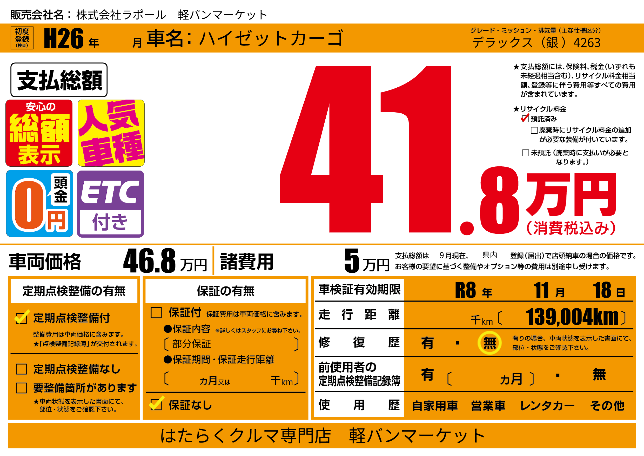 | 車名 | ハイゼットカーゴ | グレード ミッション 排気量 |