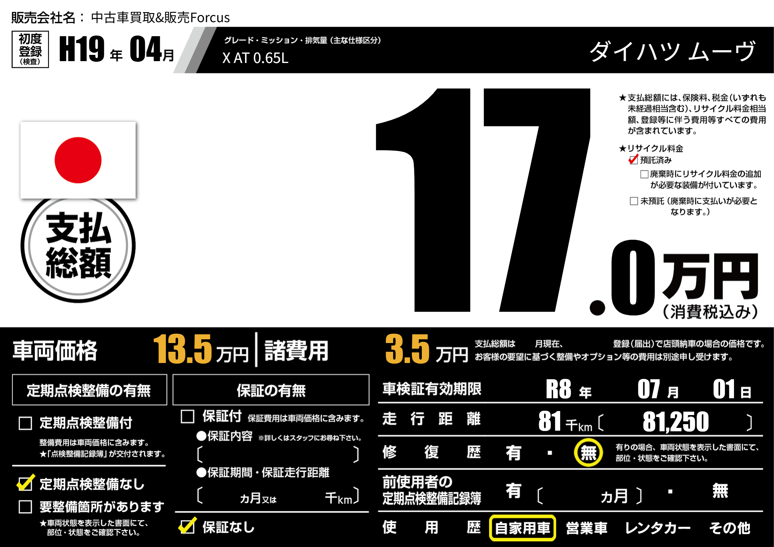 | 走行キロ | 8.1万km | 初年度登録 | H19年04月 |
